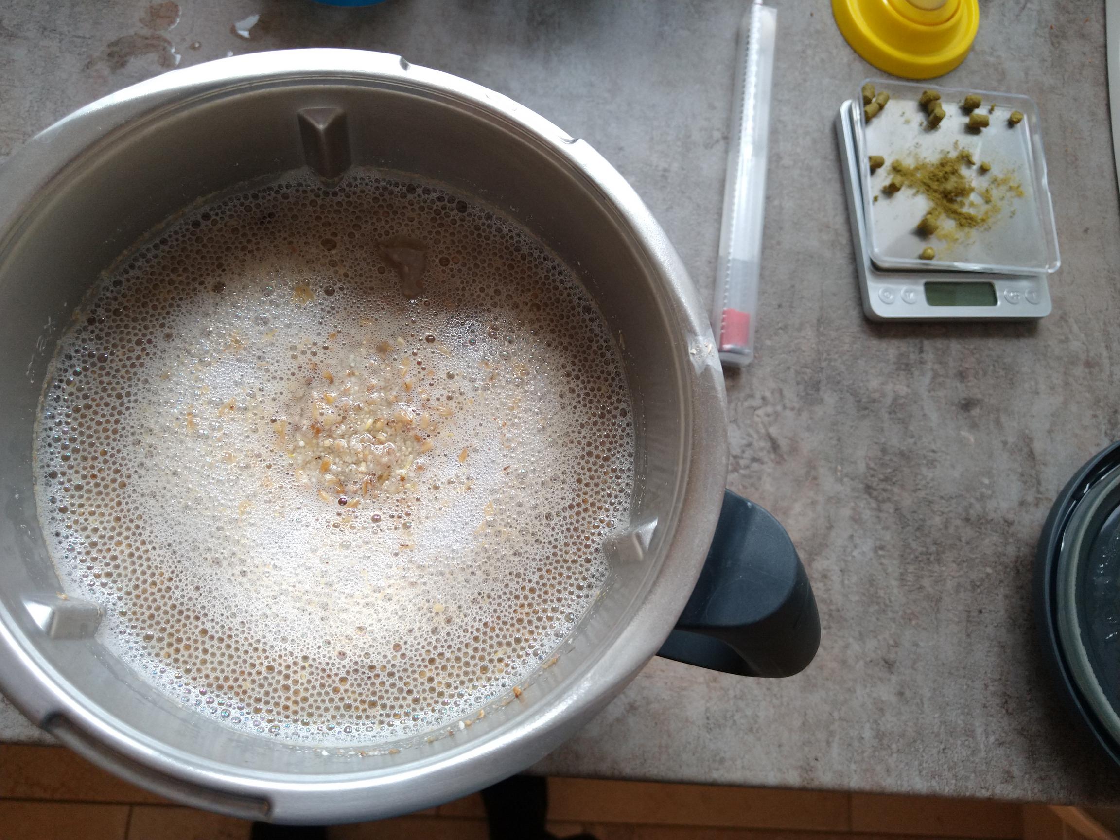 läuft automatisch weiter 4g Sorachi Ace NG 2l TM meldet fertig Läutern. Mal ganz simpel mit einem Küchensieb Kochen aufm Herd auf unter 80°C + WP anstelltemperatur 18°C erreicht ohne foto S05 rein (quasi zweite Führung)