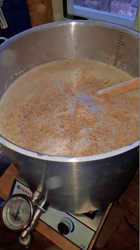 Heute, Sonntag, früh dann 7:20 Uhr Einmaischen und "Rührwerk" an (das ist das hölzerne Ding rechts im Bild :Wink ).