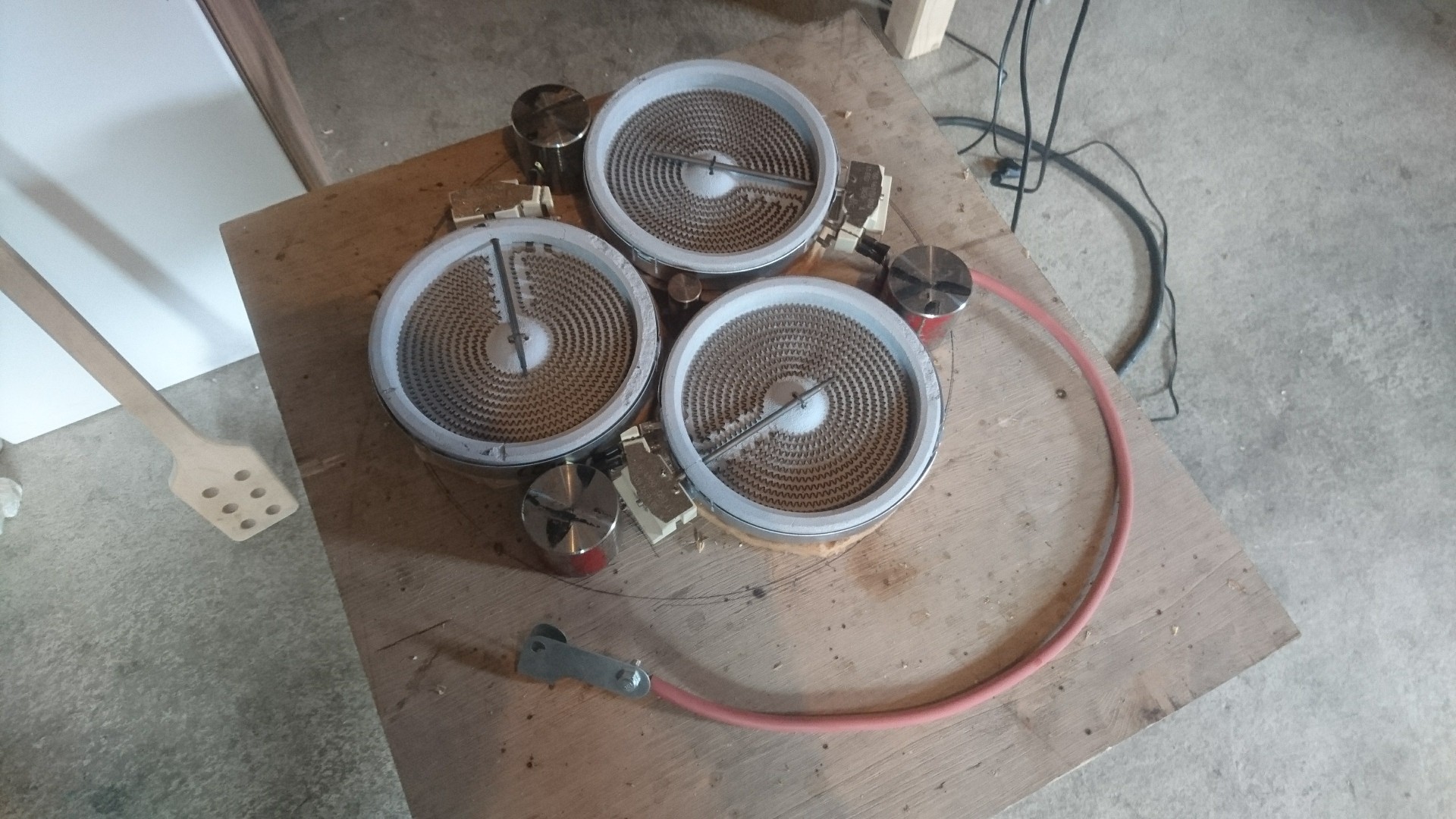 Eine Hendi war mir etwas zu teuer, dann kam ich auf Ceranfeldstrahler. Drei Stück würden vom Maß her gut unter meinen Topf passen. Schneller als ich mir Gedanken über den Rest gemacht habe hatte ich drei mal 1200 Watt Ceranstrahler für recht wenig Geld bei mir liegen.