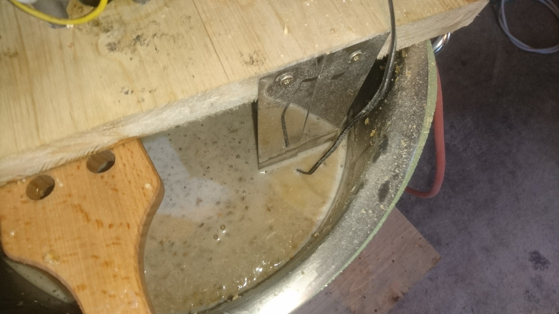 Ein Rührwerk musste auch her das haben ja fast alle hier und zudem habe ich am Anfang bestimmt genug anderes zu tun als zu rühren, vor allem da ich alleine brauen werde und deshalb keine Hilfe oder Arbeitsteilung zur Verfügung steht. Schwierig war das weniger, ein Scheibenwischermotor bei ebay bestellt auf eine Dreischichtplatte mittig geschraubt und an einer Edelstahlgewindestange ein Edelstahlblech das ich im Container in meiner Firma gefunden hatte zurecht gebogen, und mit Edelstahl Muttern fest geschraubt. Soweit so gut, leider dreht es falsch herum sprich wenn es rührt löst es sich... Passiert nichts so lange ich nicht mit dem Braupaddel darin hängen bleibe