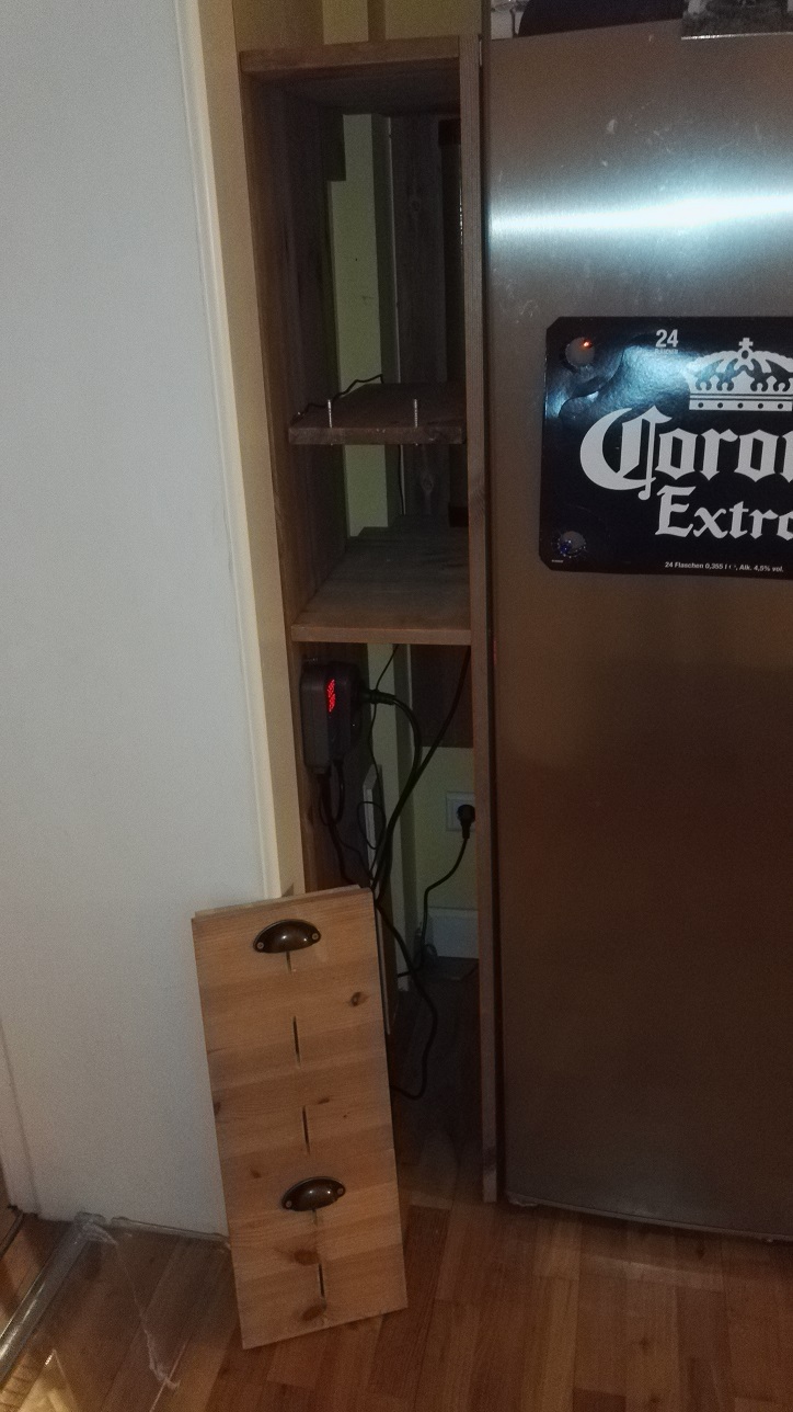 Dank Eurer Einschätzungen bleiben Bier und Brot jetzt also getrennt. Ich habe hinter dem Gefrierschrank in der Küche einen Spalt, der wegen des Heizungsrohres nicht richtig benutzt werden konnte, hier hab ich ein altes Selbstbau-Flaschenregal umgebaut und eingepasst. Wie Sven und Sebastian nutze ich einen Heizstab (bei mir aus dem Gewächshaus), den man hinten rechts senkrecht sieht, er beheizt beide "Ebenen". Der Fühler vom Inkbird ist mit in der Kammer, der Inkbird selbst ist mit WLAN und kann irgendwo versteckt werden. Das Zwischenbrett ist schmaler als der Zwischenraum und wird durch Schrauben eingespannt, so kann die Luft im ganzen Raum zirkulieren. Der Deckel war das alte Zwischenbrett und wird nur eingespannt.