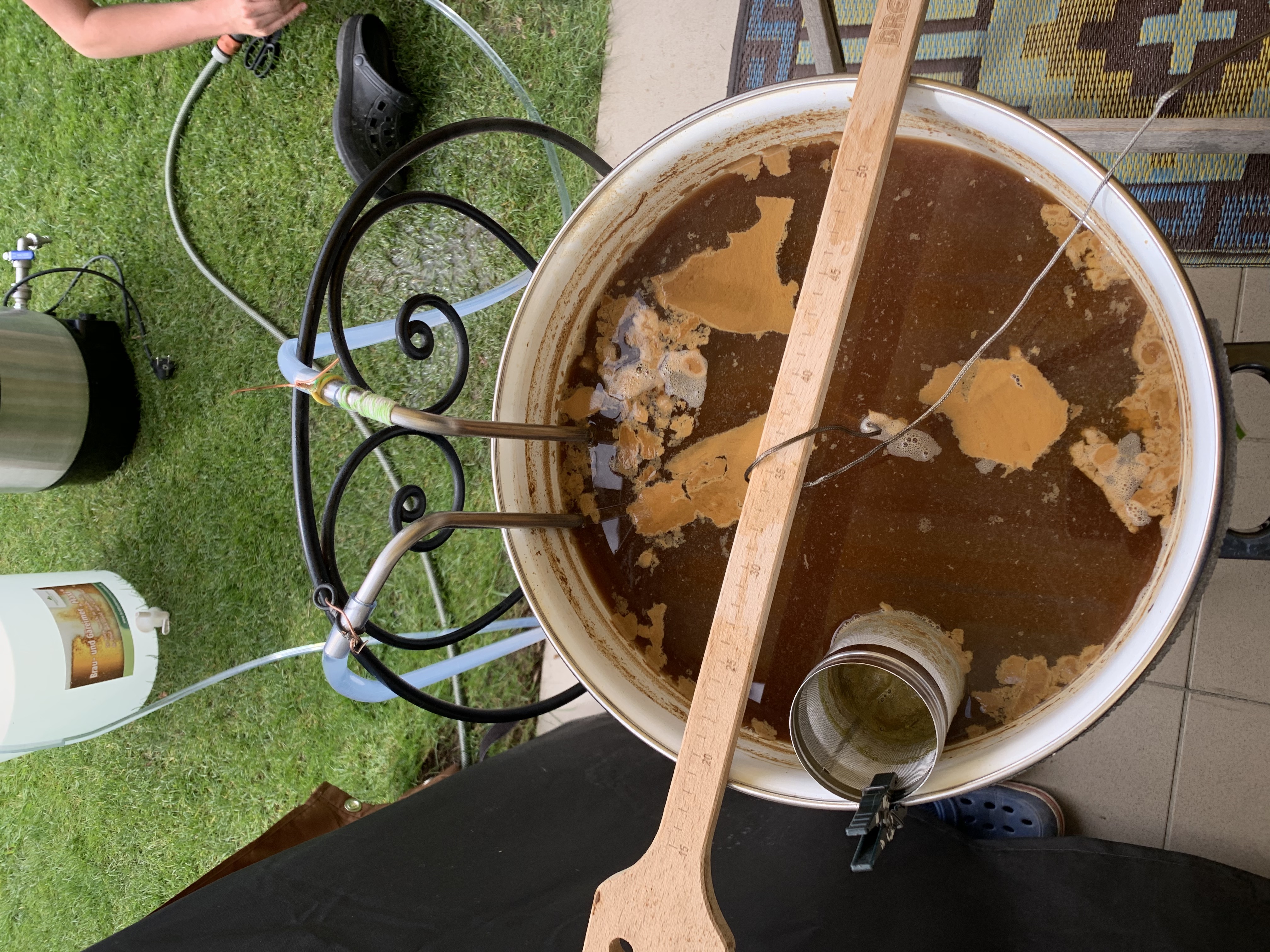 Nach dem Kochen wird mit Eintauchkühler runtergekühlt und mit dem warmen Kühlwasser gleich das Equipment grob gereinigt. Da das Ding mit üblichen Schlauchschellen nicht dicht werden wollte musste am Ende die gute alte 2,5mm² Kuperlitze herhalten, die hat das dicht bekommen.
