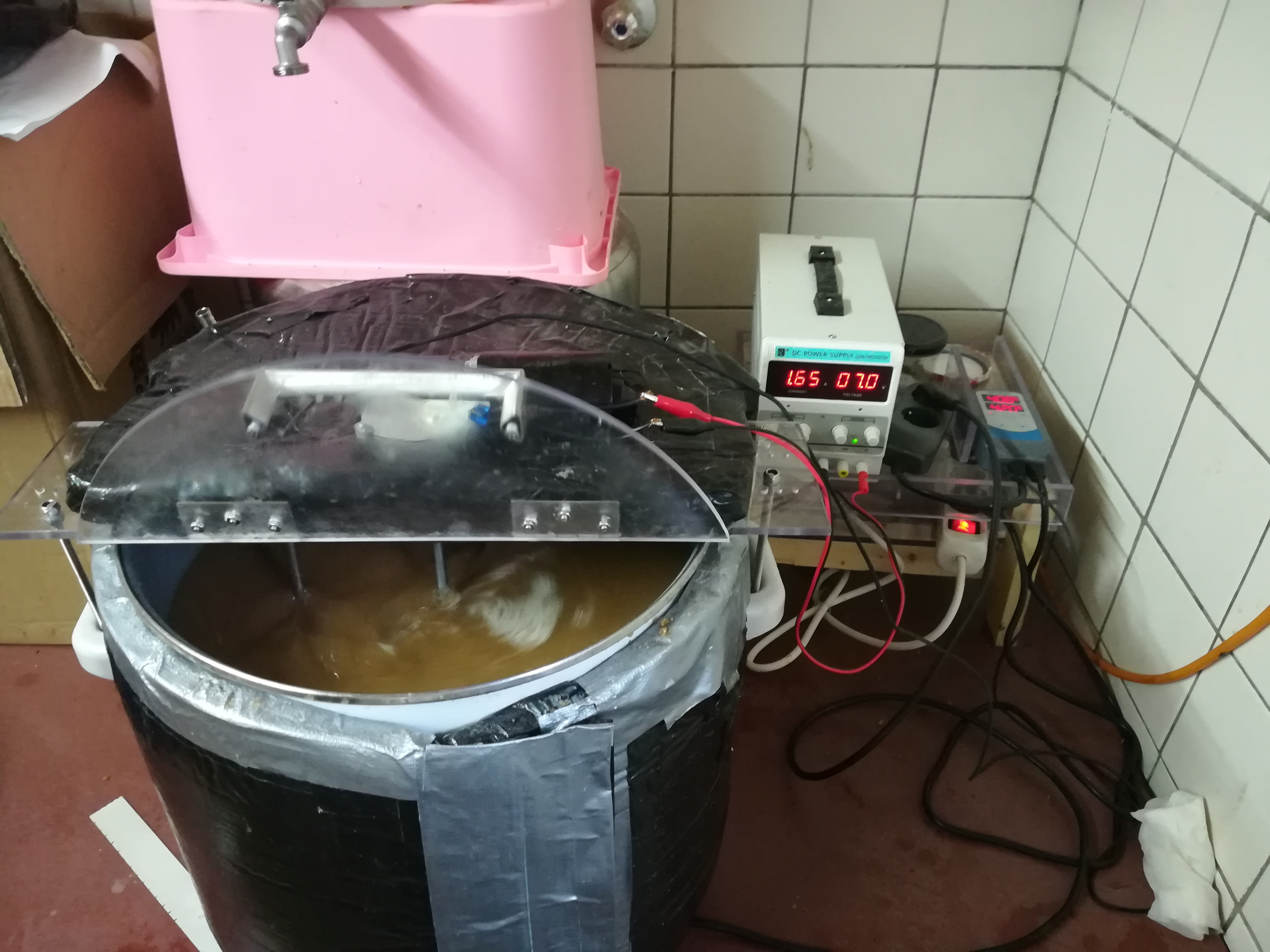 Da leider weder das Prallblech noch die Temperatursonde meines Rührgerätes lang genug waren für die erste Halbe Menge der Maische, war ausnahmsweise Rudern angesagt. Bei der geringen Menge an Flüssigkeit war es recht schwer die Temperaturen ordentlich zu halten. Naja, wenn das hier ein überragendes Ergebnis wird, denke ich mal über einen Umbau / Neubau nach.