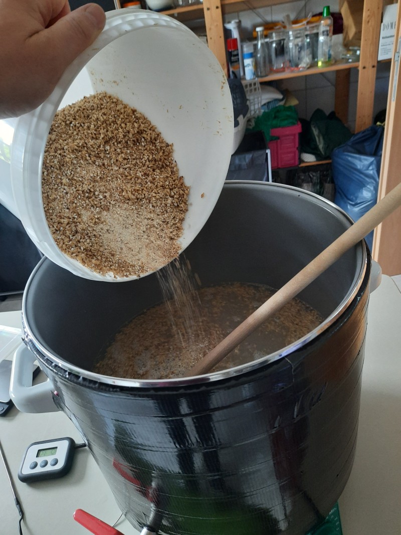 Ist ganz schön dick die Maische, da nach kurzer Zeit noch 4 Liter Wasser zugebrüht werden.