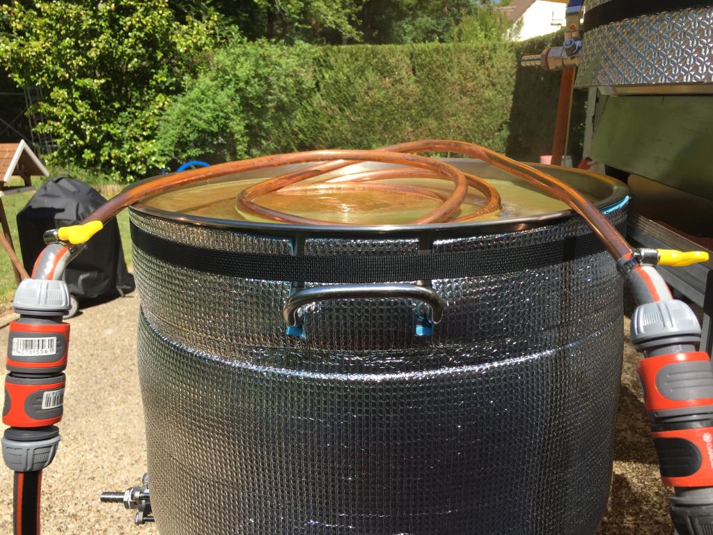 Vorher hatte ich im 68 Liter Amihopfen Topf eine Braupartner Kühlspirale, 15 Meter Edelstahl. Hat mir lange gute Dienste geleistet und wird jetzt verkauft. Gestört hat mich vor allem, dass das Rohr senkrecht nach oben geht, Deckel auflegen nicht möglich.