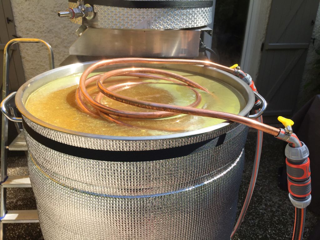 60 Liter Bier kühlen geht jetzt deutlich schneller. NB, ich kühle in der Pfanne und bewege die Spirale nicht, da ich den Trub nicht aufwirbeln möchte. Ein Whirlpool entfällt bei mir.