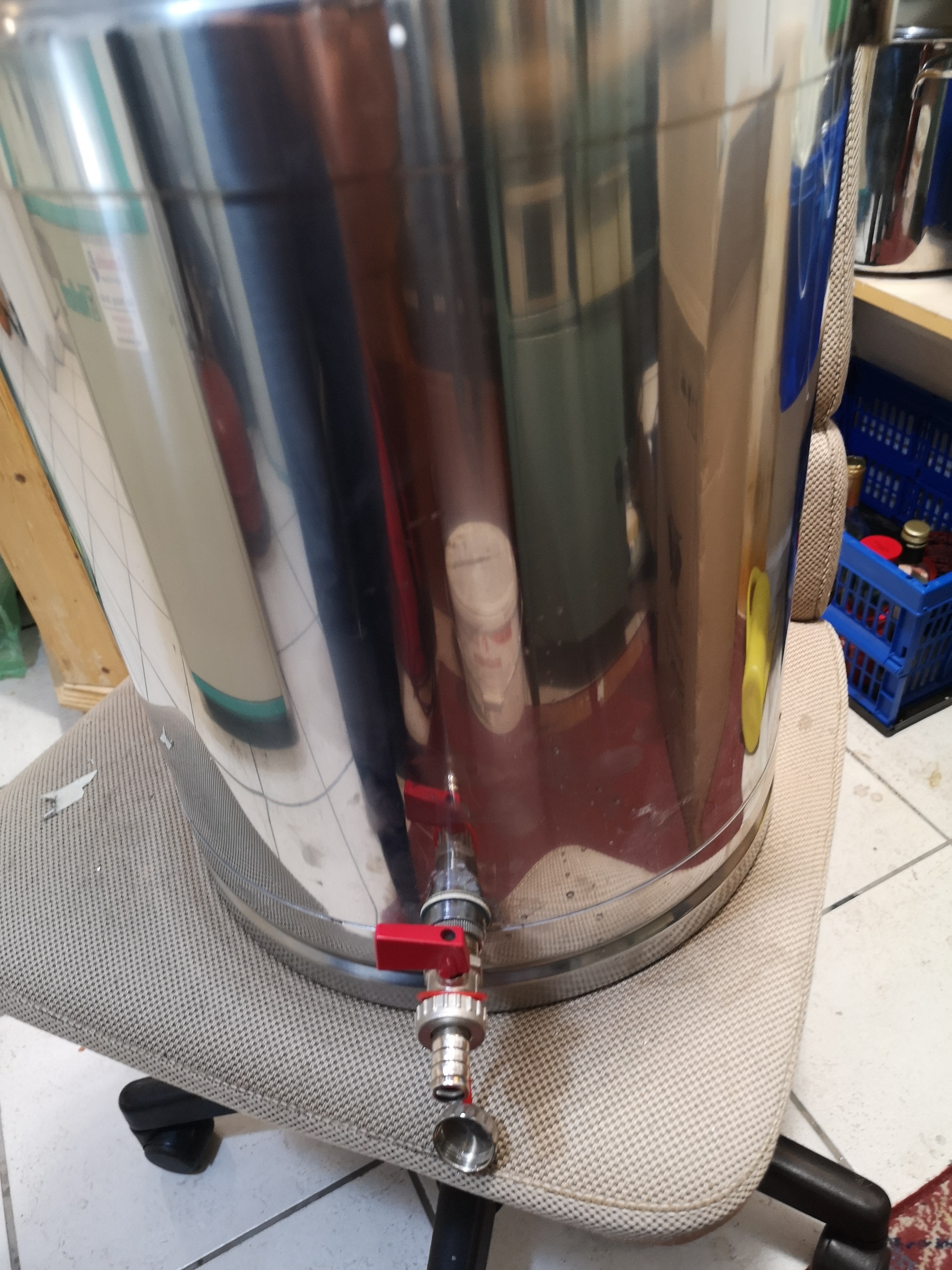 Man könnte einen 1/2 Zoll Edelstahl Hahn mit Schlauchtülle und Taschen-Thermometer einbauen und später mal eine Kühlschlange mit Inkbird-Steuerung.