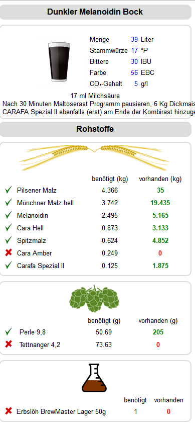 Hier mal ein dunkler Bock, 17°P, mit 30% MüMa, 20% Mela, 10% Cara, Rest PiMa und Spitzmalz. Da wollte ich bewusst mal in den Grenzbereich.