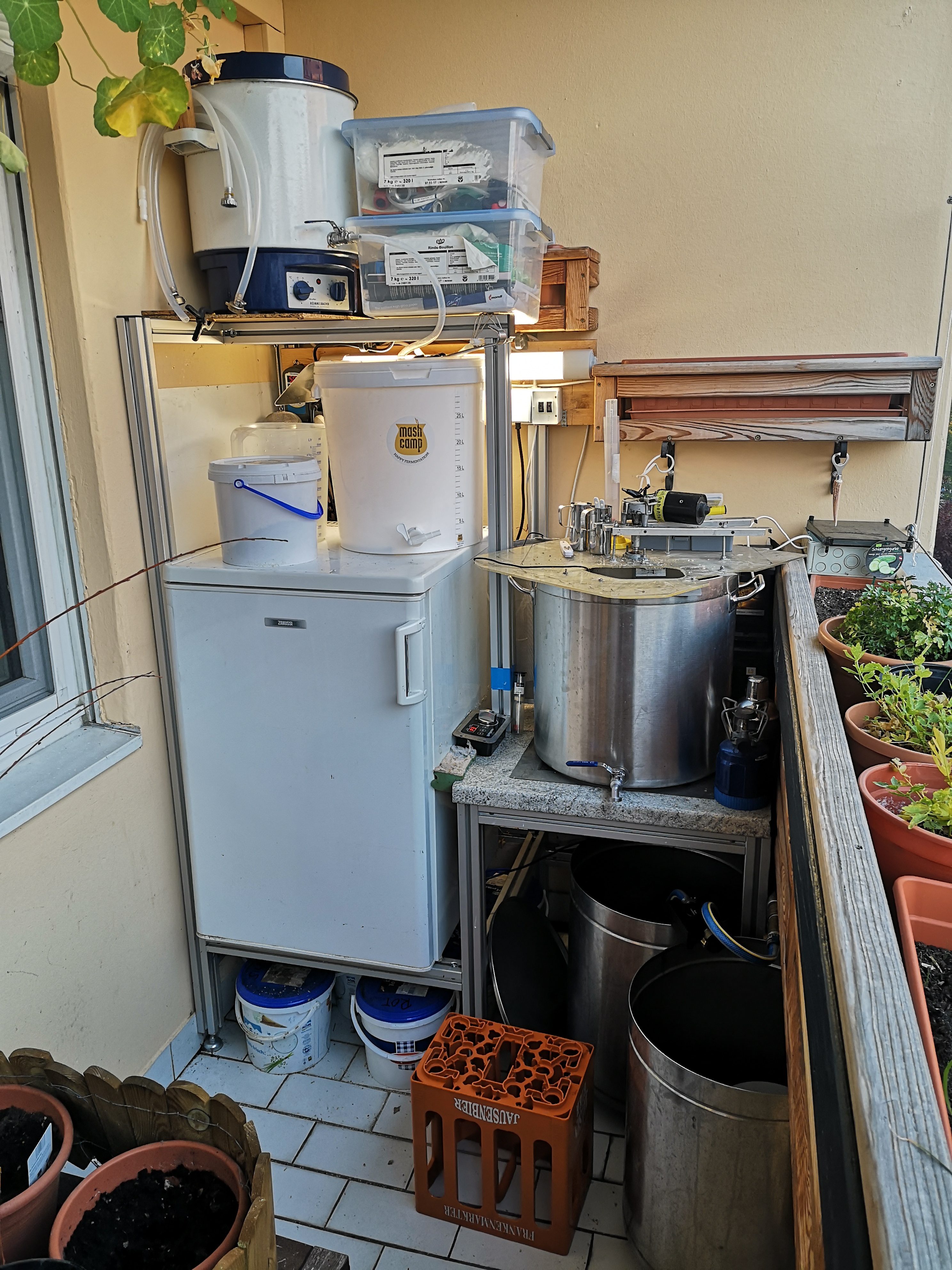 Mittlerweile besteht sie schon aus einem 40 l Edelstahltopf mit 1/2 " Auslass, Eigenbau- Rührer, 30 l Einkocher für den Nachguss, Gär-Kühlschrank mit Ink-Birdsteuerung und Heizmatte,