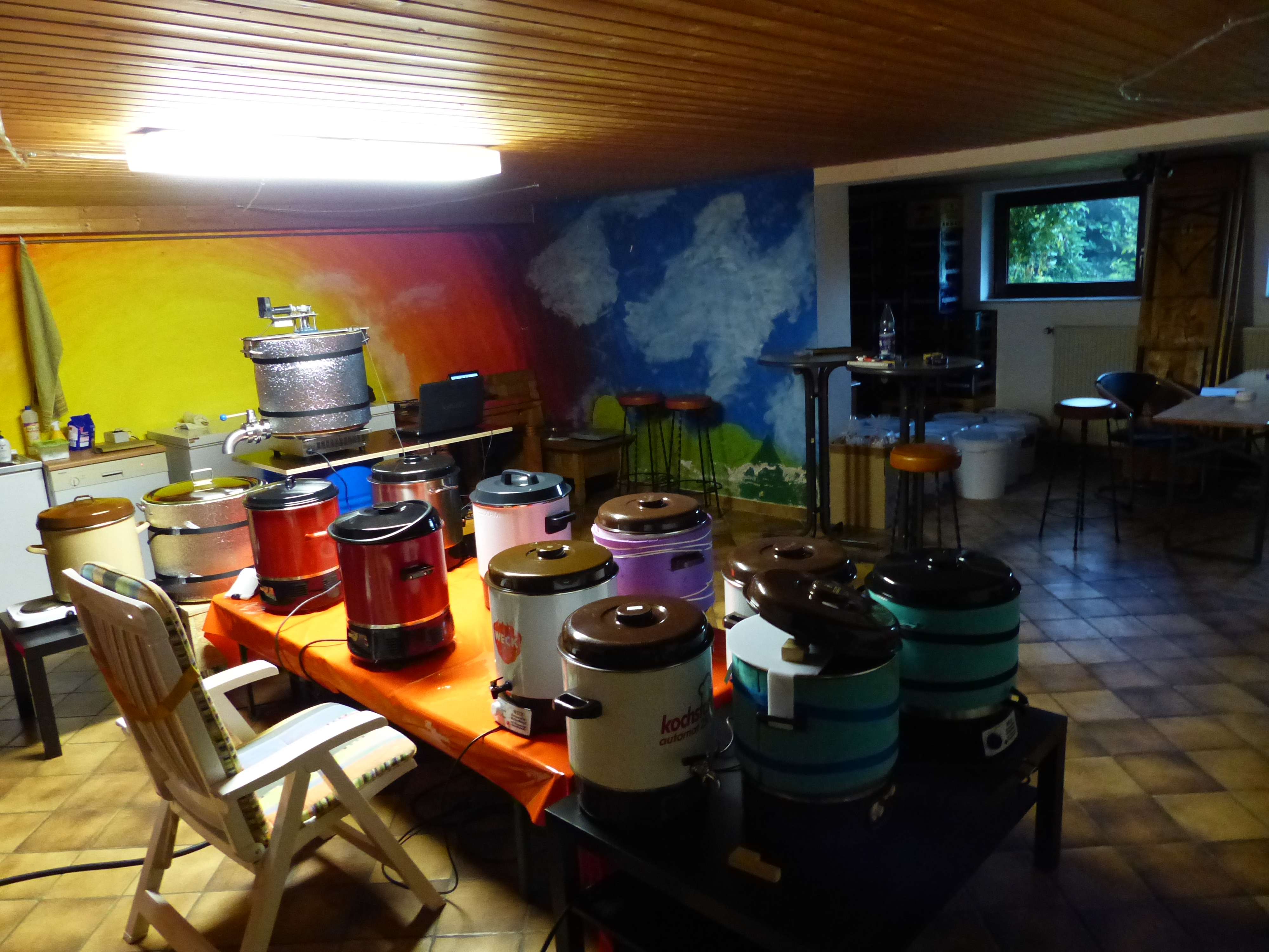 Insgesamt laufen mit Nachgusspötten elf Einkocher und meine Hendiplatte! Das macht ca. 24.000 Watt, wobei ja nie alle gleichzeitig laufen werden, aber das nur am Rande.
