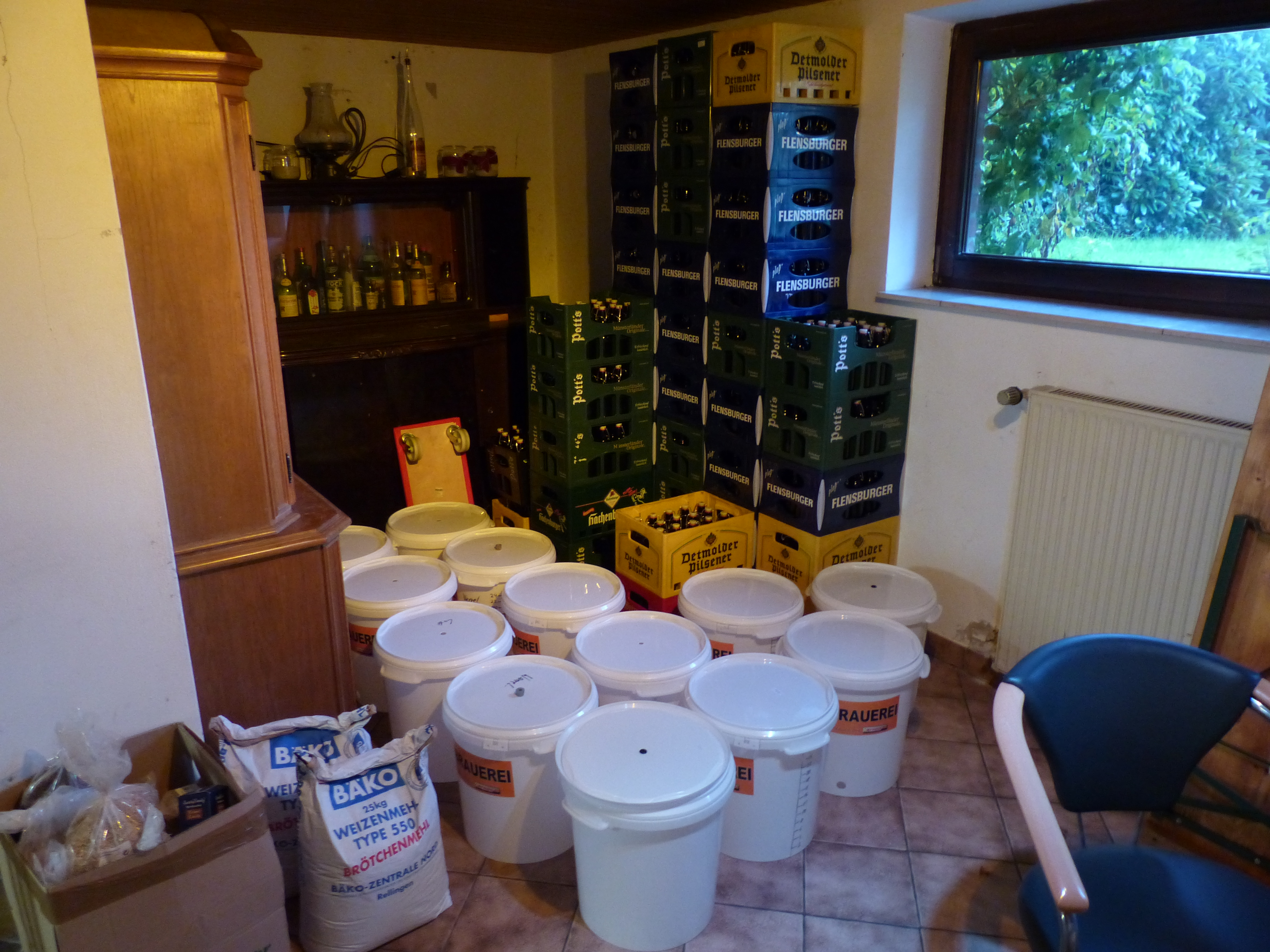 Wir haben zwei Fenster in dem Keller, die den ganzen Tag offen stehen. Die Tür zum übrigen Keller ist so gut es geht verschlossen. Die Holzdecke ist natürlich beim Maischen und Kochen etwas nass, aber es hält sich in Grenzen. Der Keller wird auch sonst gut gelüftet und ist ziemlich trocken. Ich habe bis jetzt in keinem Kellerraum Schimmel gefunden und hoffe, dass es dabei bleibt. Ansonsten muss man reagieren.