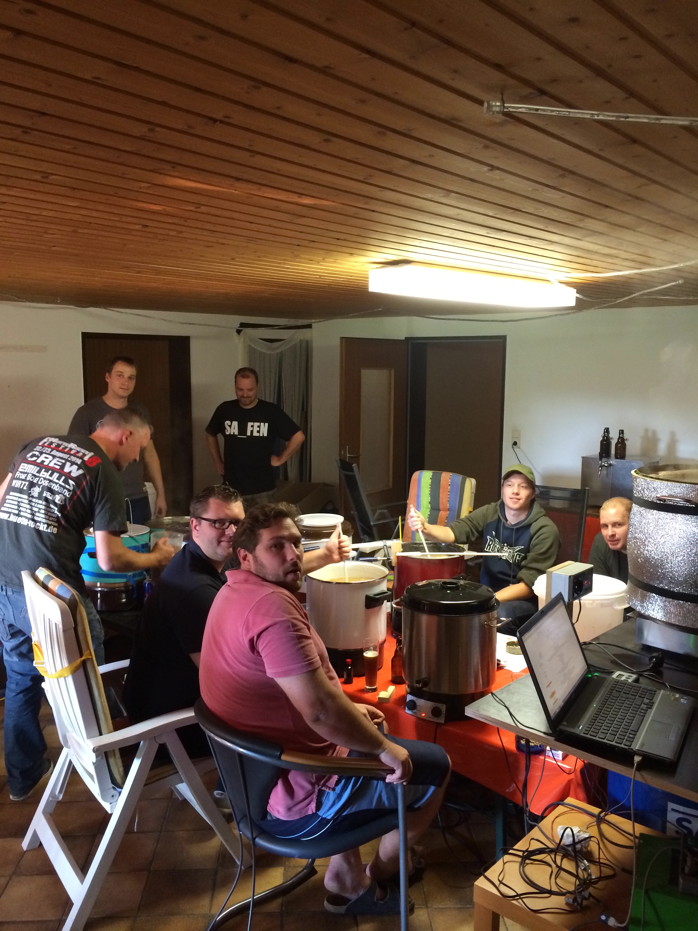 Mittlerweile sind wir acht Hobbybrauer, die regelmäßig bei mir im Keller die Töpfe anschmeißen. Leider ist die Wachstumsgrenze erreicht, da einfach kein Strom mehr über ist!
