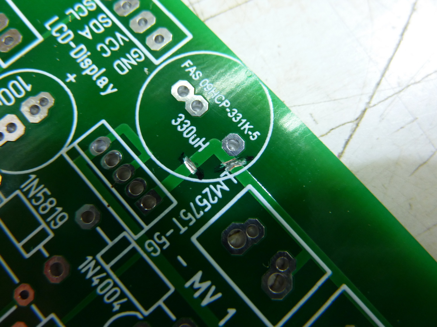2) an der Unterseite 1 Trennschnitt ( Leiterbahn Drossel>Spannungsregler Pin1)