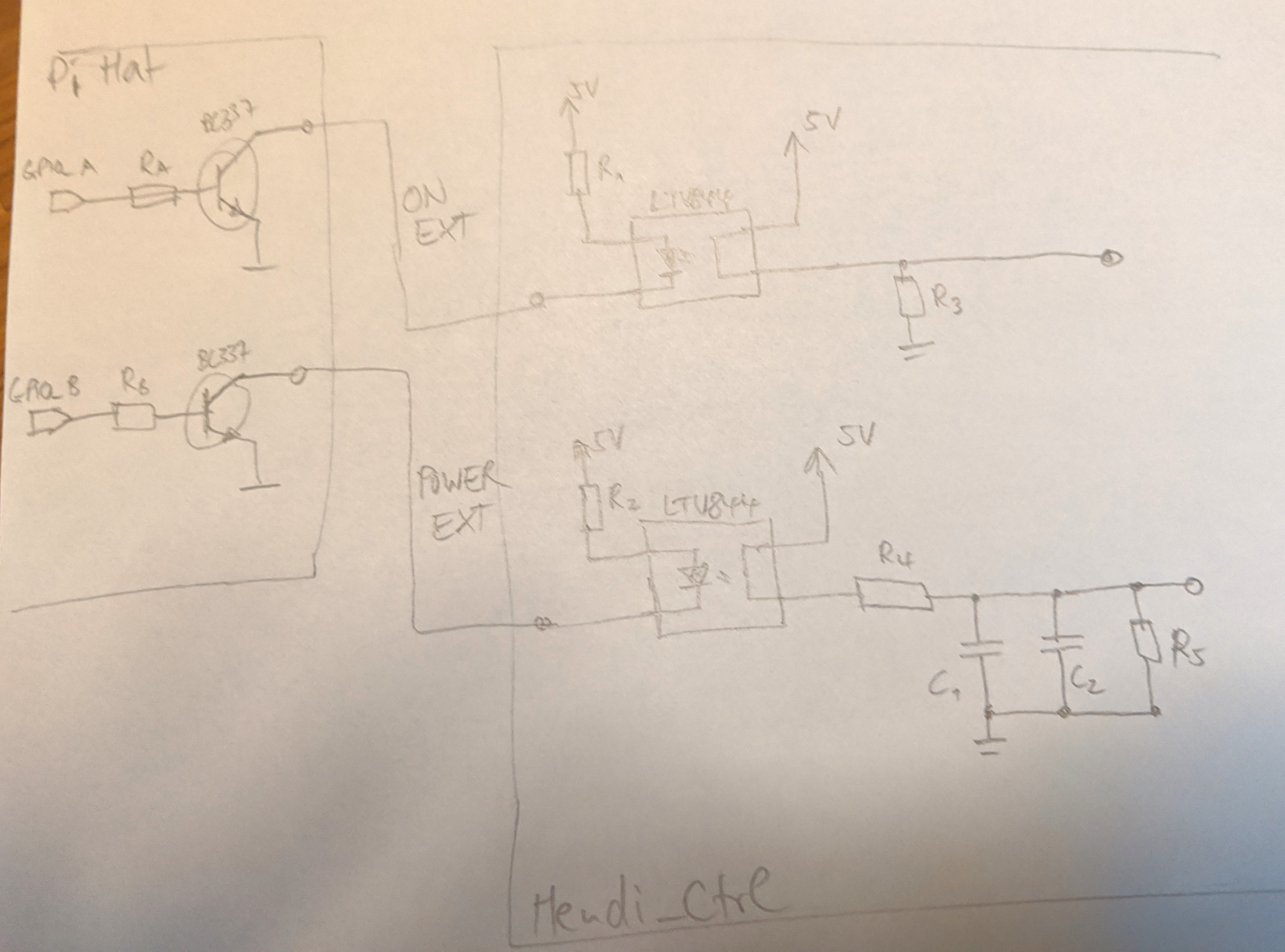 Hmmm, da liegt wahrscheinlich der Hund begraben. Dann wär natürlich sehr interessant wie J1 auf Seiten des Pi beschaltet ist. Ich habe für beide Signale (On_ext und Pwr_Ctrl_ext) da einen Open Collector (BC337) an den GPIOs und ziehe damit die Kathode des Optokopplers jeweils auf GND, wenn der GPIO low ist. Sorum geht's dann natürlich nicht. Die Frage ist, wie ich das jetzt fixe...