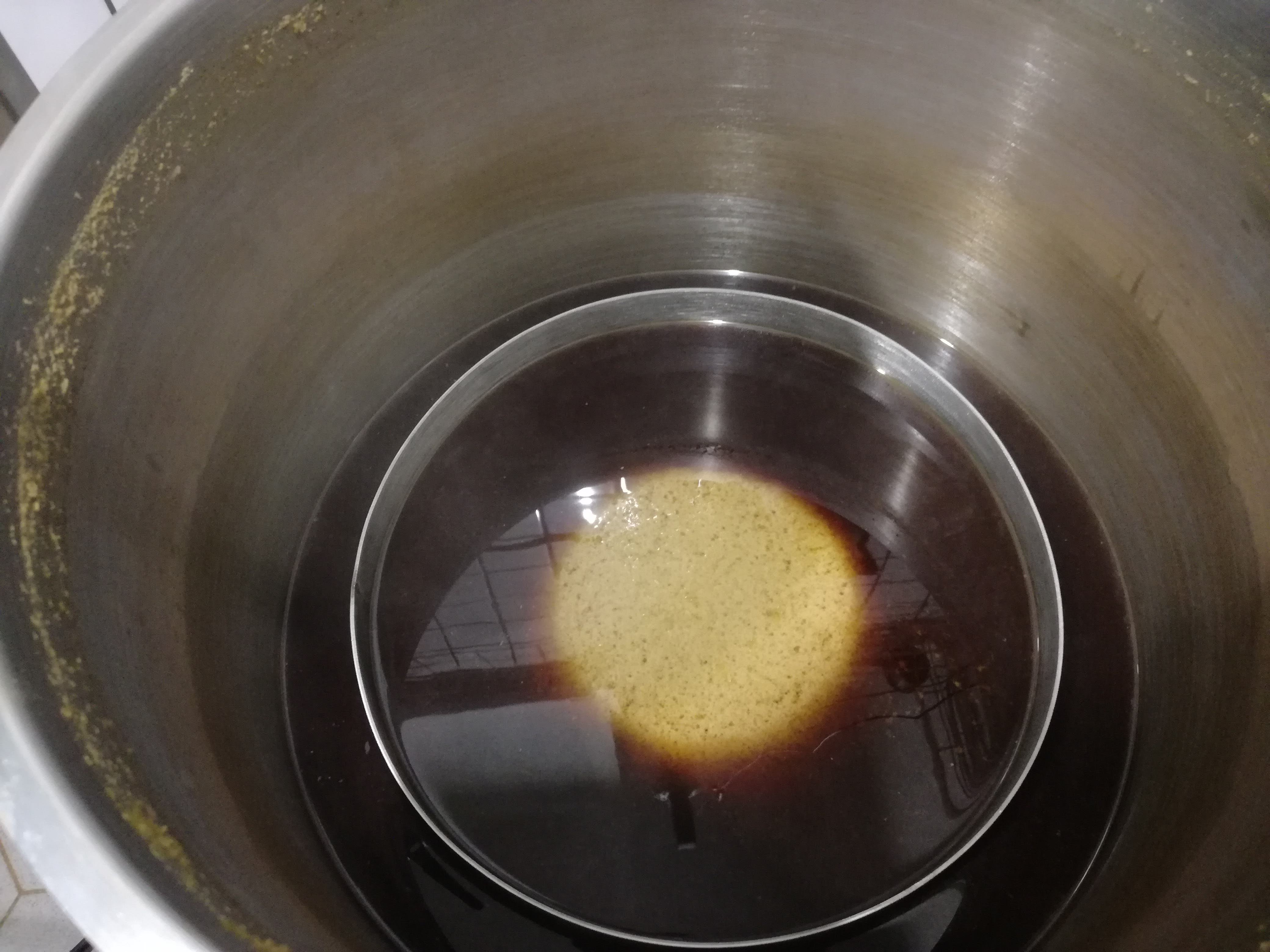 1. Ich koche in einem 150l Pott aus Edelstahl. Nach dem Kochen versetze ich alles mittels Braupaddel in Bewegung