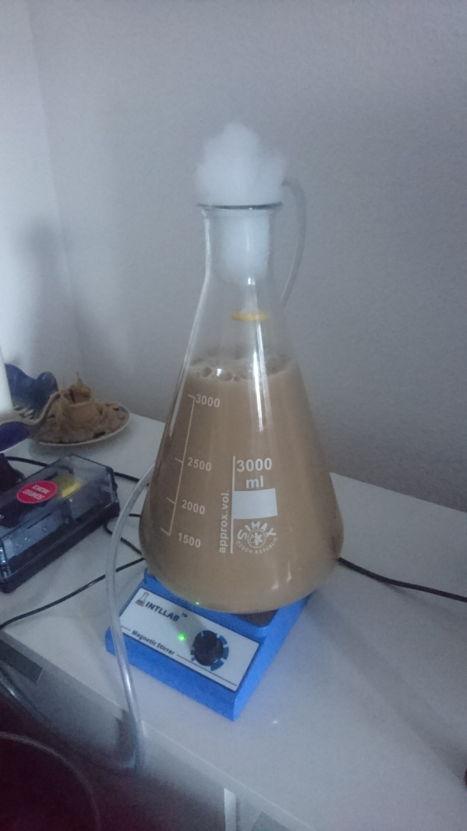 - die Würze mit der Hefe mit einem Elektroquirl vermischt und belüftet