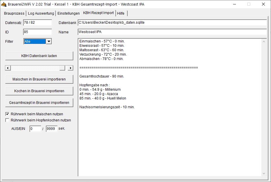 Datenbank wird fehlerfrei gelesen und richtig im Importfenster angezeigt. Beim anschließenden Import in die Brauerei ergibt sich ein Fehler in der Rastbezeichnung. Das Einmaischen erscheint doppelt, dadurch werden die anderen Rastbezeichnungen falsch zugeordnet. Abmaischen fehlt. Temperaturen und Zeiten passen.