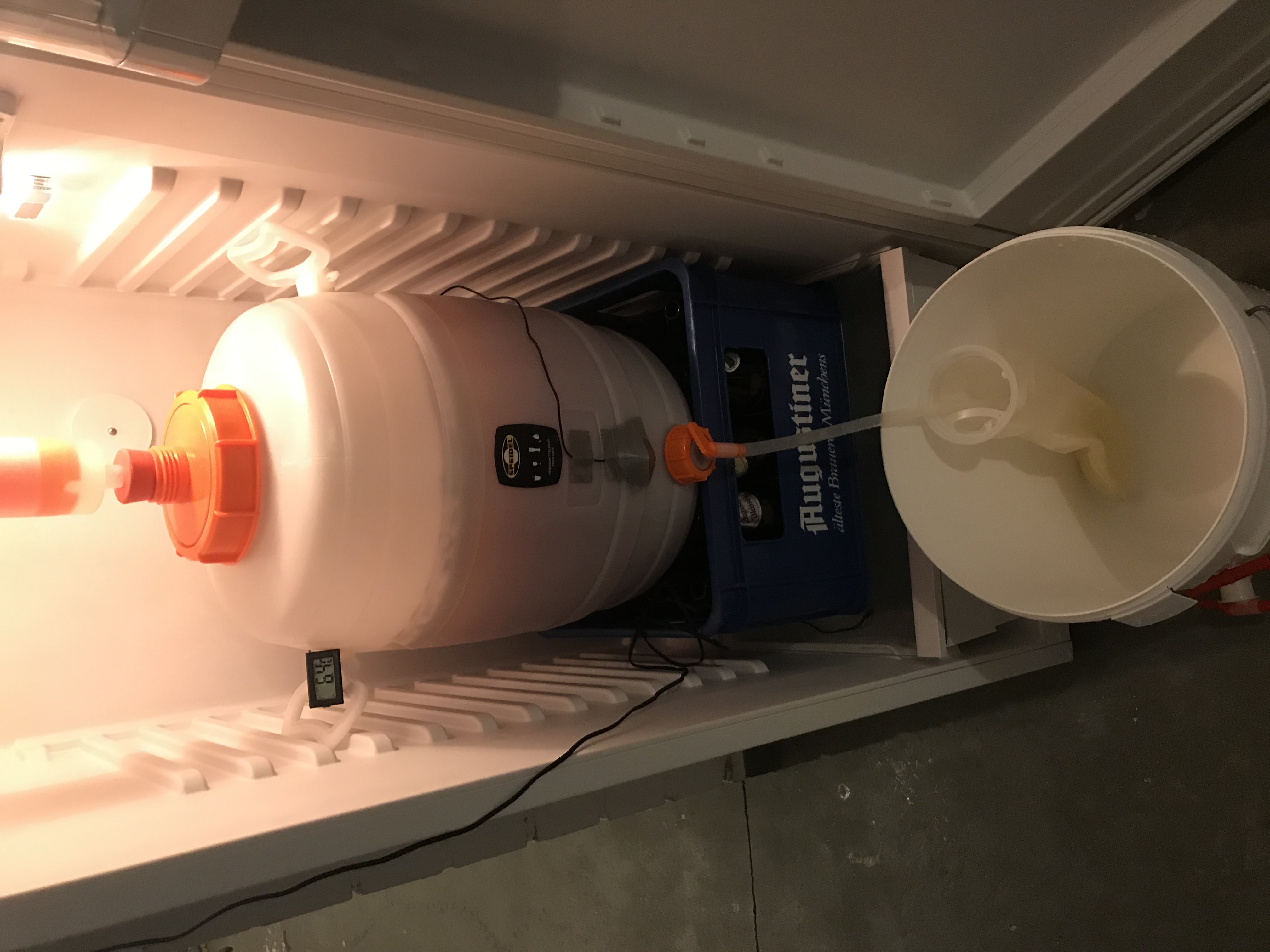 Nachdem ich mit dem Refraktometer drei Tage hintereinander einen Wert von 7,9 Brix ermittelt habe, habe ich die Hauptgärung für beendet erklärt und den Kühlschrank soweit wie möglich runtergeschraubt um einen Effekt von einem Cold Crash zu bekommen, was sich nur mäßig umsetzen ließ. Der Kühlschrank schafft tatsächlich 2°C jedoch schaltet er sich dann von alleine ab und fängt erst bei 8°C wieder an zu kühlen. Hier muss ich den Kühlschrank noch etwas modifizieren. Vielleicht den Fühler ausbauen o.Ä.