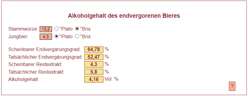 In der Küche angekommen nehme ich eine Probe für die Spindel und stelle diese kurz auf die Heizung um die Probe auf 20°C zu bekommen. Die Spindel zeigt einen Wert von ca. 4,3° Plato an. Wenn ich nun meine Parameter bei Fabier.de eingebe, dann erhalte ich die folgenden Werte: