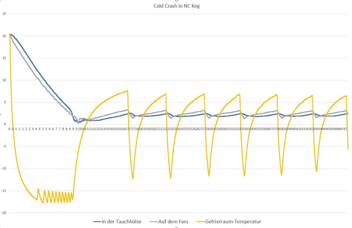 Ein bisschen Informationen: ich habe zuletzt die Gärtemperatur im NC Keg geloggt. Die Temperatur am Fass und im Fass sind nicht sehr weit auseinander. Wer sparen will und gern DIY macht, kann einfach sein Temperaturfühler am Fass isoliert kleben. Beides ist IMO weitaus besser als die Verwendung von Gefrierschrank-Umgebungstemperatur zur Steuerung der Gärtemperatur.