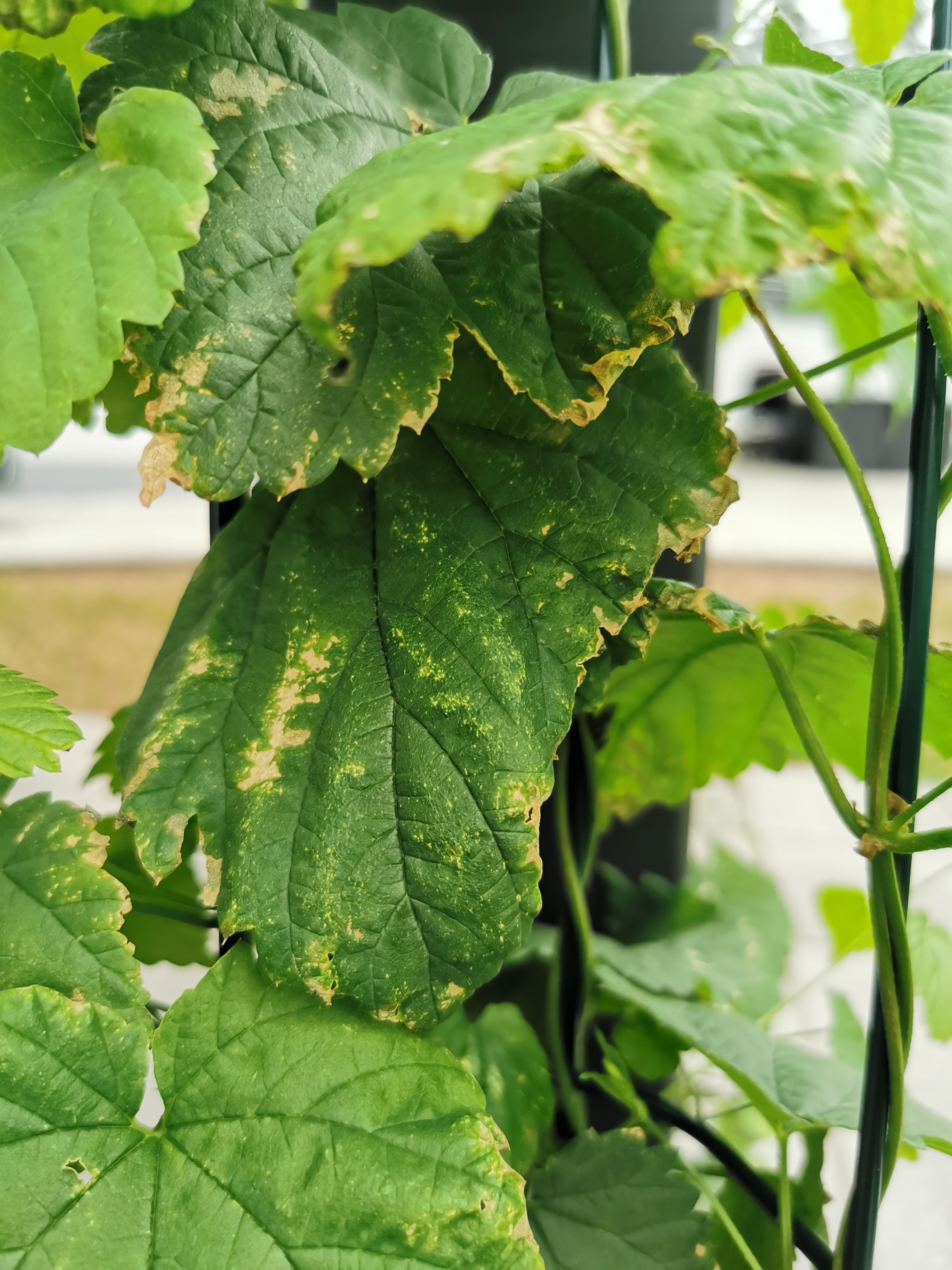 Habe Mandarina Bavaria und Ariana bei Heickelmann Mitte März bestellt. Im April ging es schon mit den Symptomen an den Blättern los, diese braunen Stellen enstehen an den Blatträndern und in der Blattmitte. Die jeweils unteren Blätter sind am stärksten betroffen. Oben wächst der Hopfen allerdings vorerst symptomlos munter weiter. Mitte Mai alle betroffenen Blätter abgeschnitten, jetzt geht es an den unteren Blättern allerdings schon wieder los. Ich habe die Pflanzen in großen Kübeln (für Drainage ist gesorgt) auf einem sonnigen Balkon, gieße jeden Tag und dünge 1 mal pro Woche mit Gemüsedünger (aber eher verhalten).