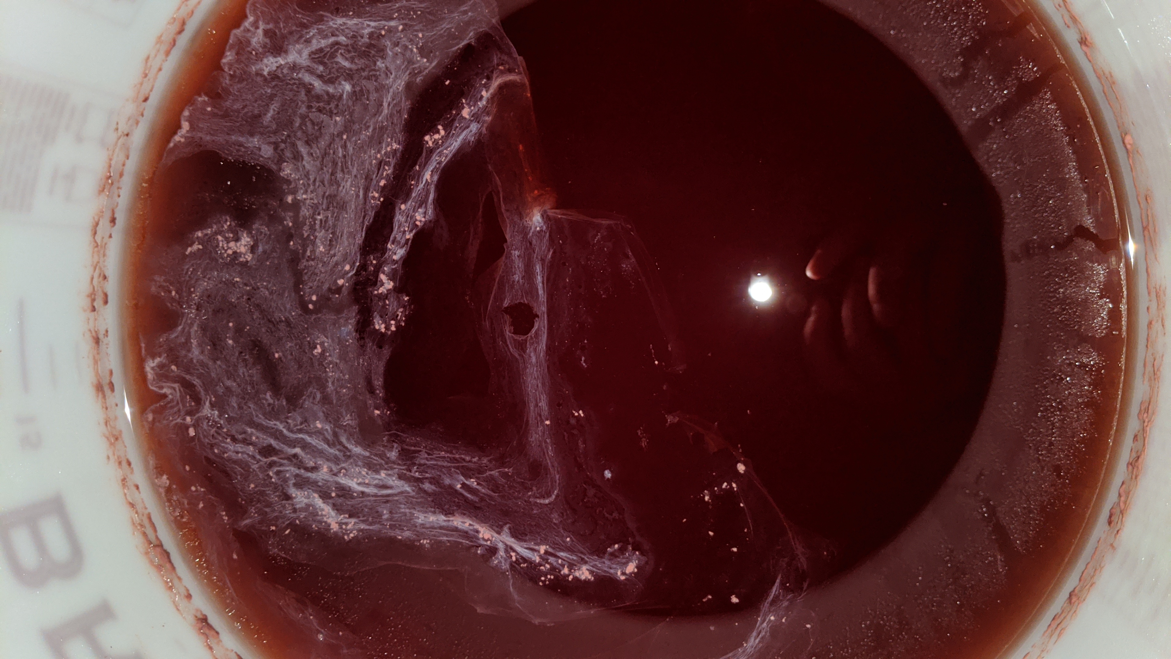 Zweiter Tag, noch vor dem Entnehmen der Probe einen an Essig erinnernden Geruch wahr genommen. Intensiv wenn man über dem Gärbottich Stand, kaum wahrnehmbar bei 1,5 Meter Entfernung. Geschmack der Probe unauffällig.