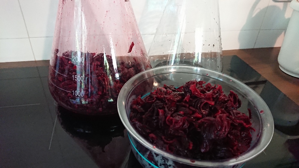 Grundlage ist ein konzentrierter doppelter Heißauszug aus 650g Hibiskusblüten (10g/l). Das Zeug war nach dem Abkühlen richtig dickflüssig bzw. "schnodderig".