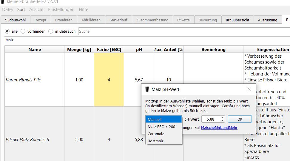 Du kannst den Malz pH-Wert manuell eingeben (falls bekannt oder selbst bestimmt) oder automatisch wie bei MMuM über den Malztyp in Abhängigkeit von der Farbe (EBC).