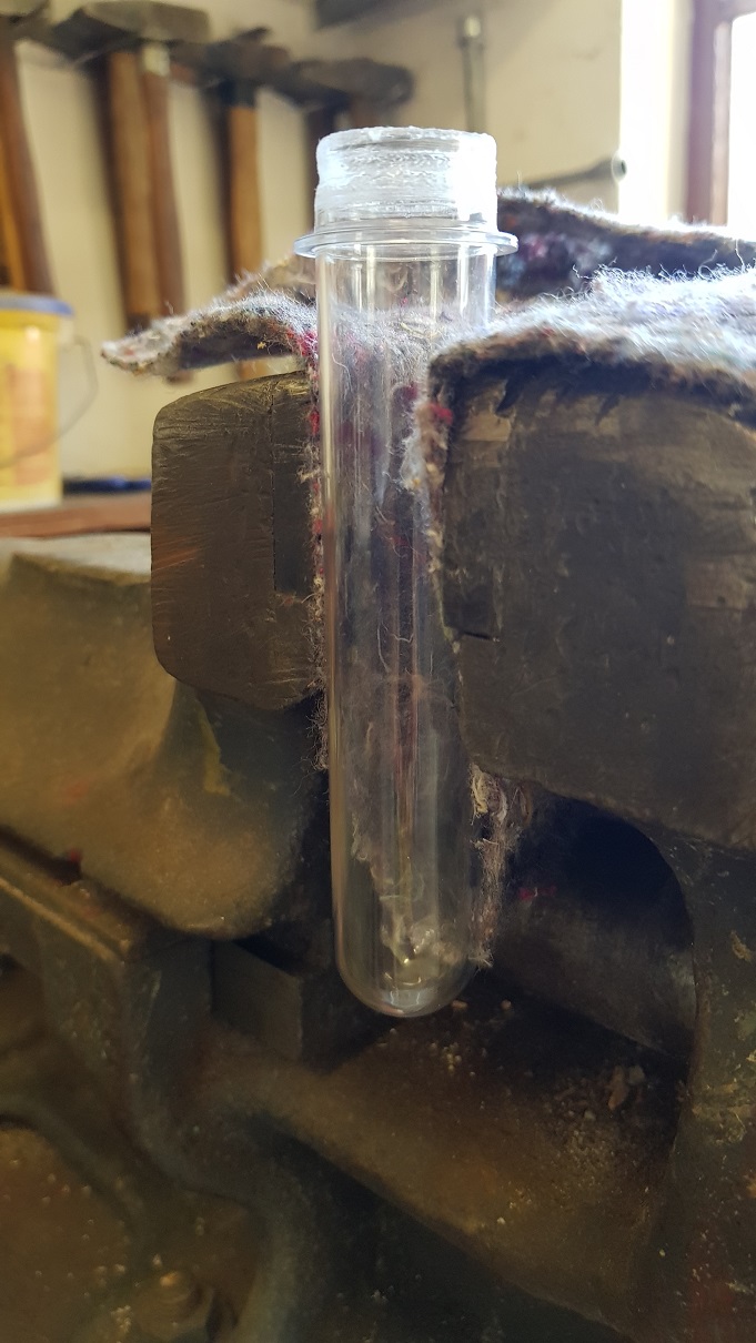 - Sobald das Epoxidharz ausgehärtet ist, die Kunststoffhülse in eine Drehbank einspannen (vorher mit Krepp-Klebeband umwickeln um Schäden an der Außenfläche zu verhindern)