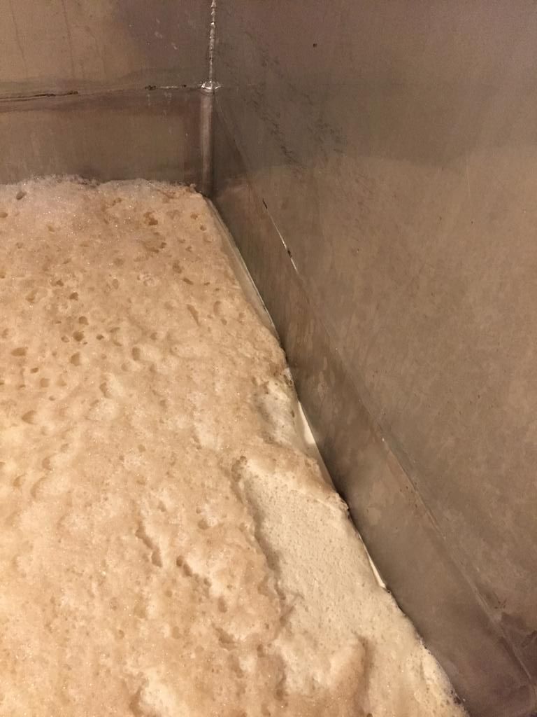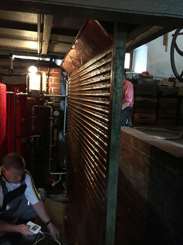 Während des Verweilens auf dem Kühlschiff, desinfizieren wir den Berieselungskühler. Dieser hat eine neue Kaltwassereinspeisung bekommen, die heute Premiere feiert. Leider nicht ganz erfolgreich, aber das führt hier zu weit. Grundsätzlich ist so ein Berieselungskühler ein sehr schönes und sinnvolles Teil. Sehr effektiv, belüftet die Würze sehr gut und es sieht wirklich herrlich aus, wenn sich die Würze wie ein Ölfilm darüber schiebt.