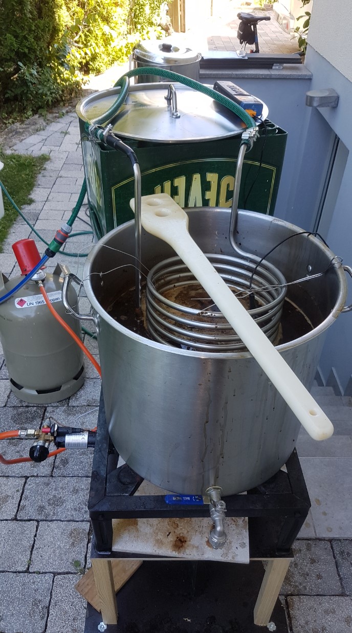 Im freien Braue ich mit einem 7,5 KW Gaskocher, Nachgusswasser wird mit einem Royal Catering 30l Wasserkocher gemacht. Mit dem ich sehr zufrieden bin.