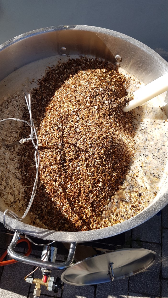 Einmaischen und rühren von Hand, 8,7Kg Malz in 27l Wasser.