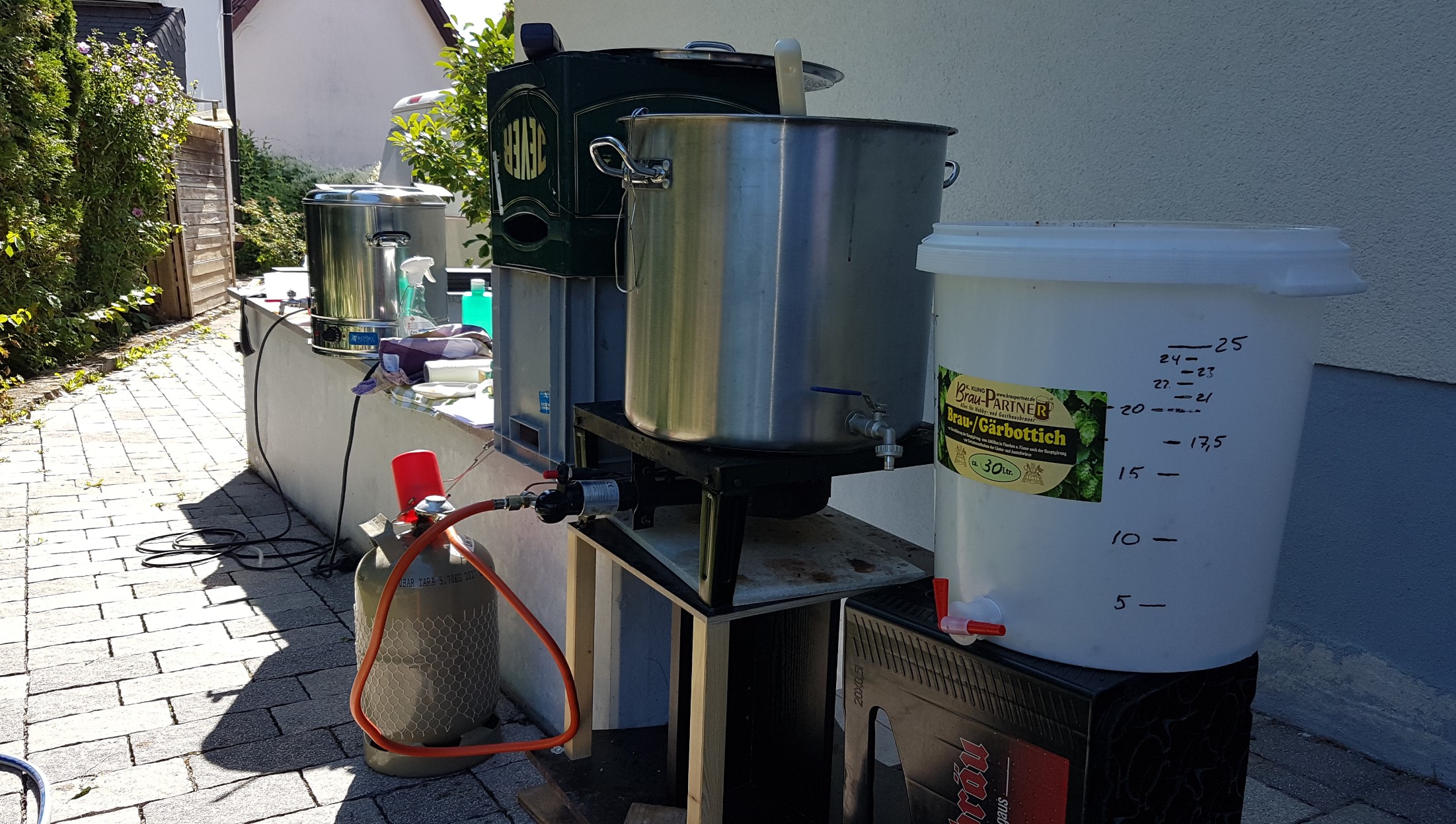 Mal ein Tip ... bei deinem selbst gebauten Hocker, wo der Einmaischbottich drauf steht, solltest du noch 2 Diagonalstreben einbauen. Ansonsten kann er den Querkräften keinen Wiederstand leisten und klappt zusammen.