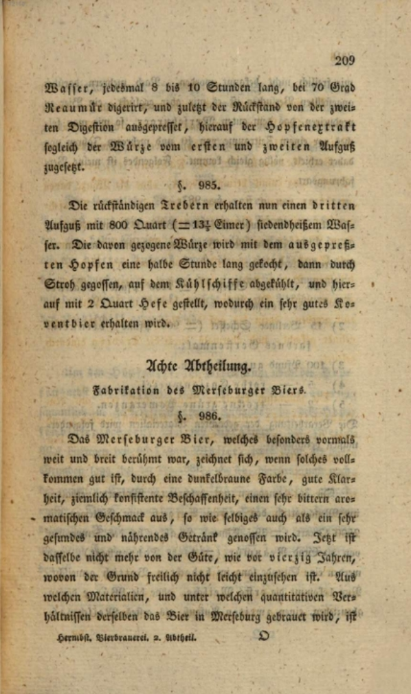 D.h. zur Zeit als die "Vollständige Braukunde" erschien (1831) hatte das Merseburger seine Blütezeit vermutlich bereits hinter sich ("ist jezt aber nicht mehr so gut"). Mit Hermbstädt ist sehr wahrscheinlich Sigismund Friedrich Hermbstädt (1760-1883) gemeint:
