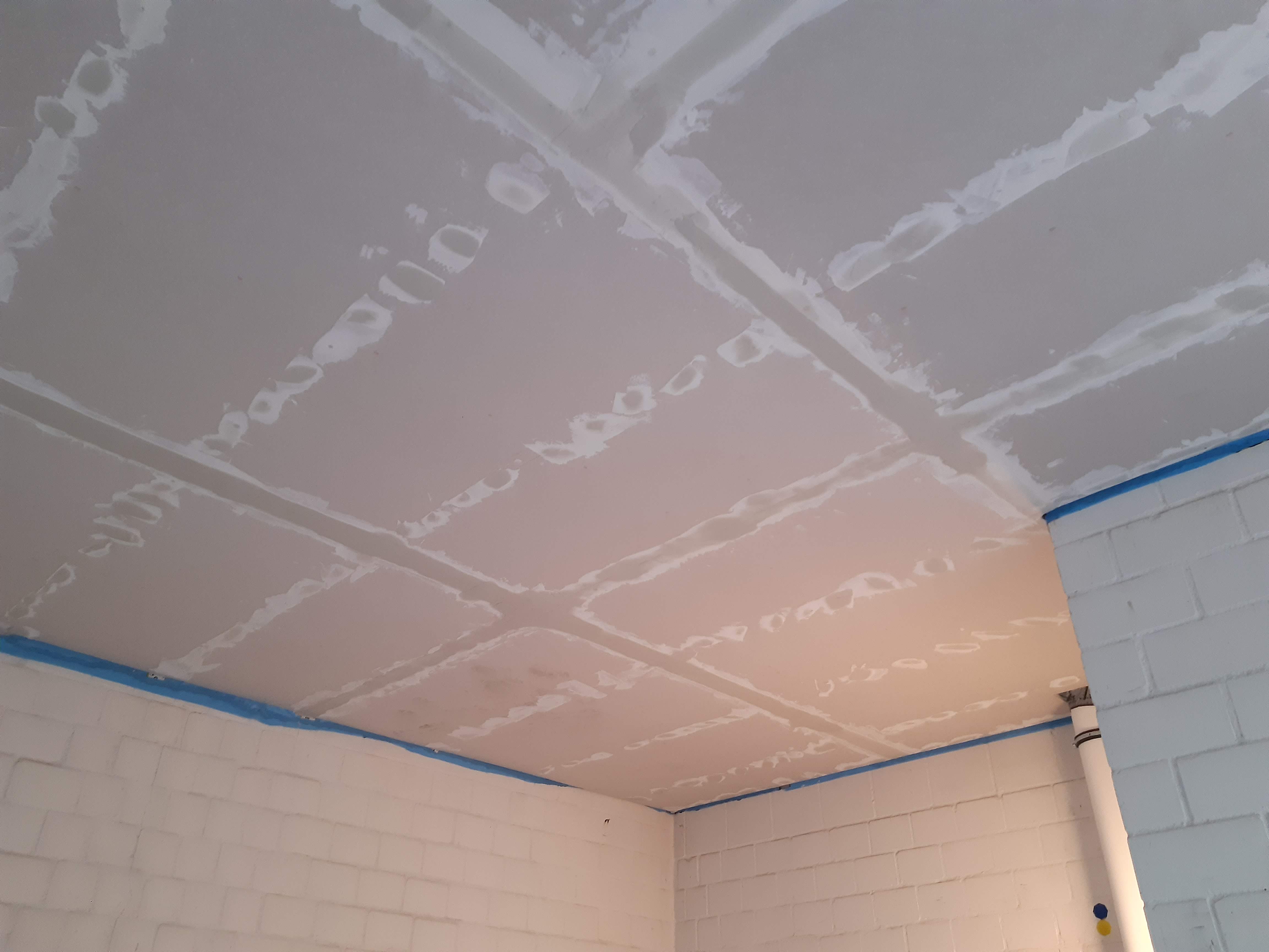 Alle Tackernadeln abkleben und erste Gipskartonplatten an der Decke montieren.