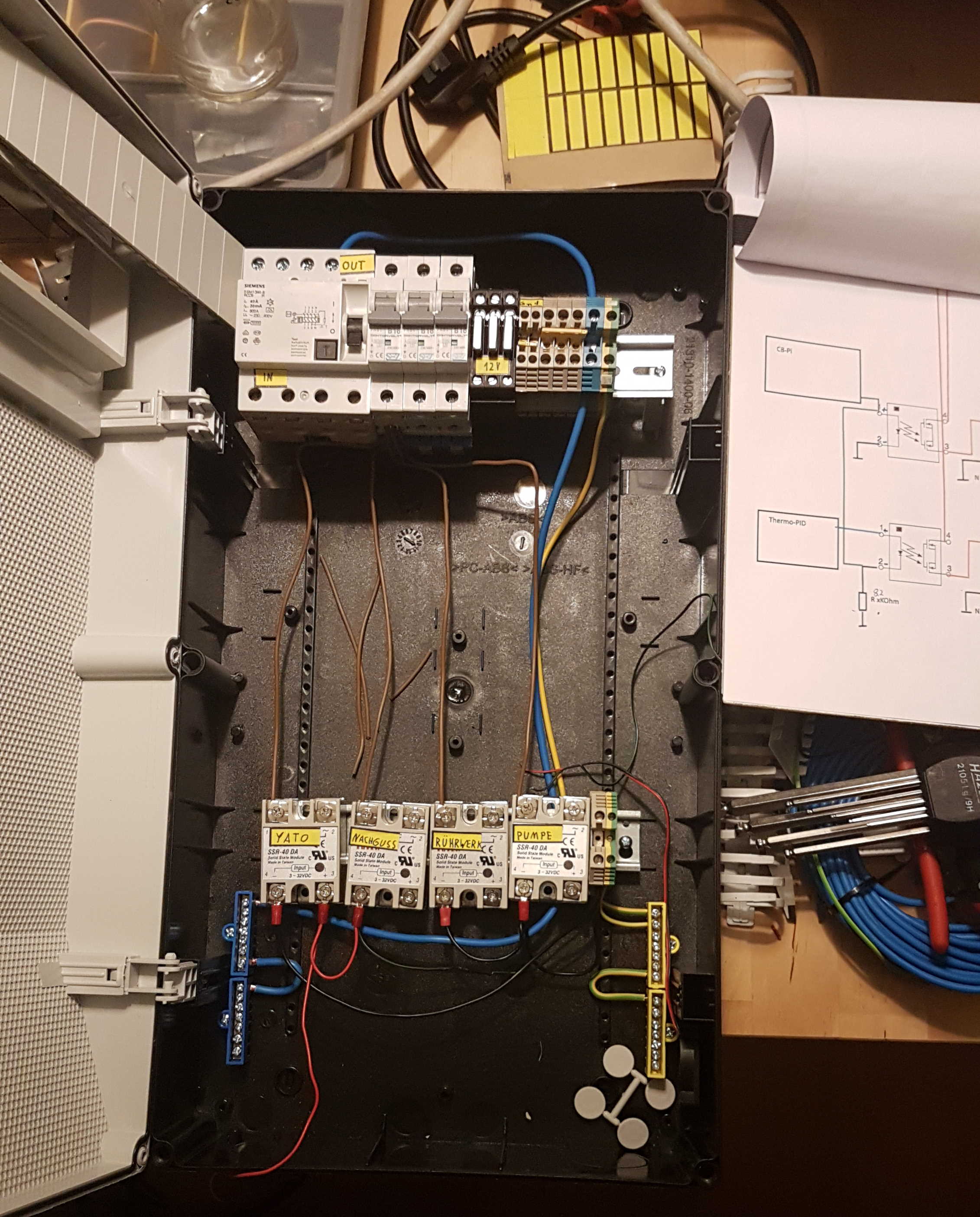 Schaltet das Induktionskochfeld ein, so fällt das Relais für den Nachguss ab. Der Schaltschrank lässt sich aber problemlos auf 3 Phasen Drehstrom umrüsten, sollte ich mal einen Keller mit 16A CEE Steckdose finden