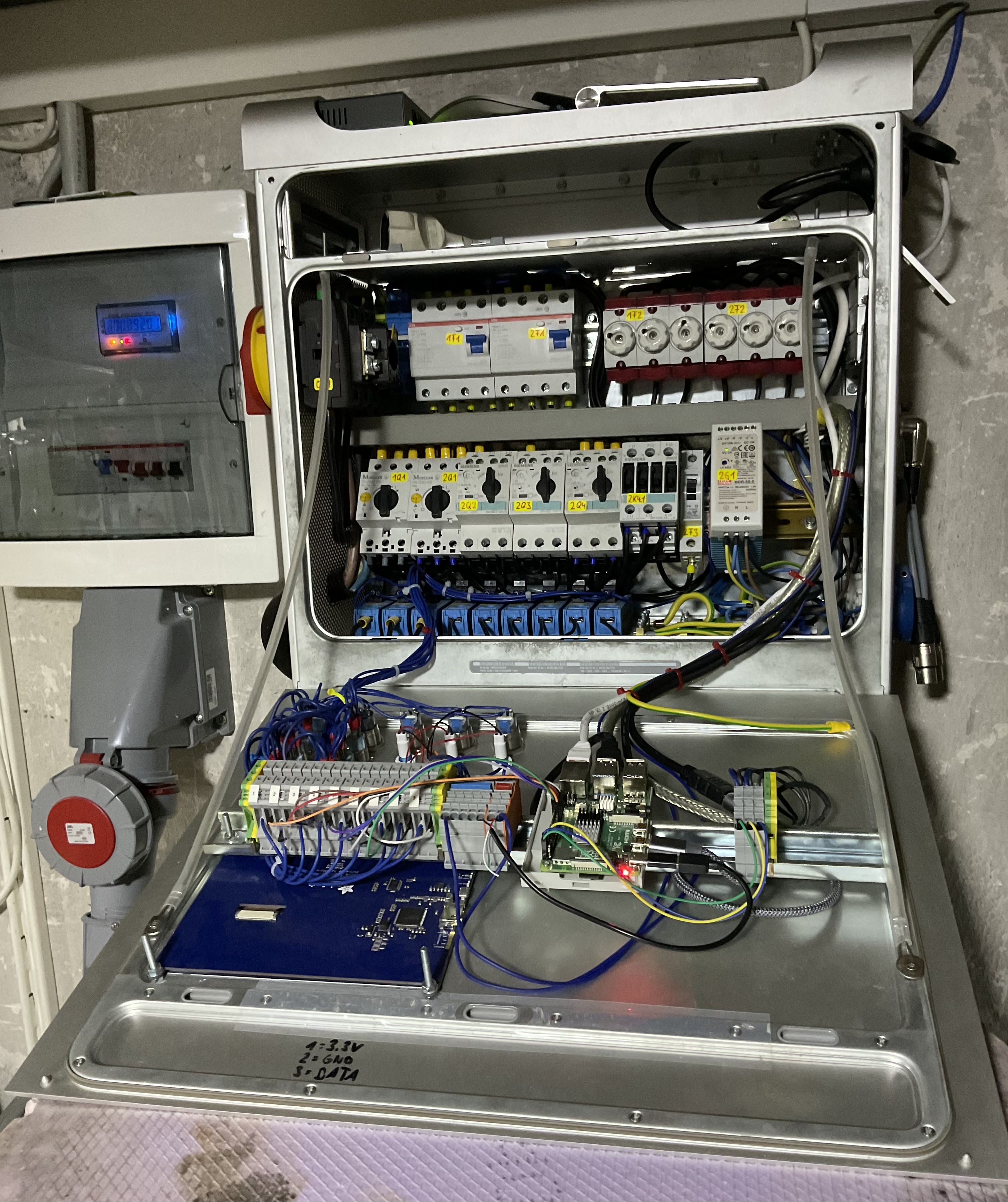 Bei der Steuerung sind wir einen etwas anderen Weg gegangen. Ich als Urmacuser konnte nicht anders... Ohne meinen Elektronik Experten wäre das alles jedoch nichts geworden. Mit den Specs, die ich ihm gegeben habe, war es fast unmöglich die Teile in den alten Mac zu bekommen. Aber dank seines überirdischen 3D Tetris Talents hat er es doch hinbekommen Steuerung, 22KW Leistung, den 5V Raspi Plunder und alle Absicherungen in den Mac Pro G5 reinzubekommen.