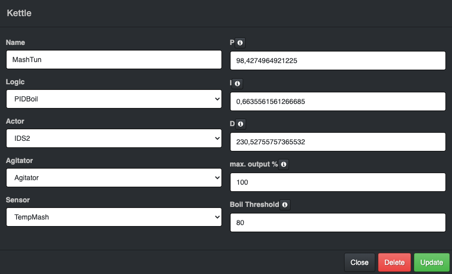 Vor allem wenn bei PIDboil den I Anteil als Nachstellzeit nimmt ist der Wer mit 0,66 zusammen mit dem P von 98 sehr krass.
