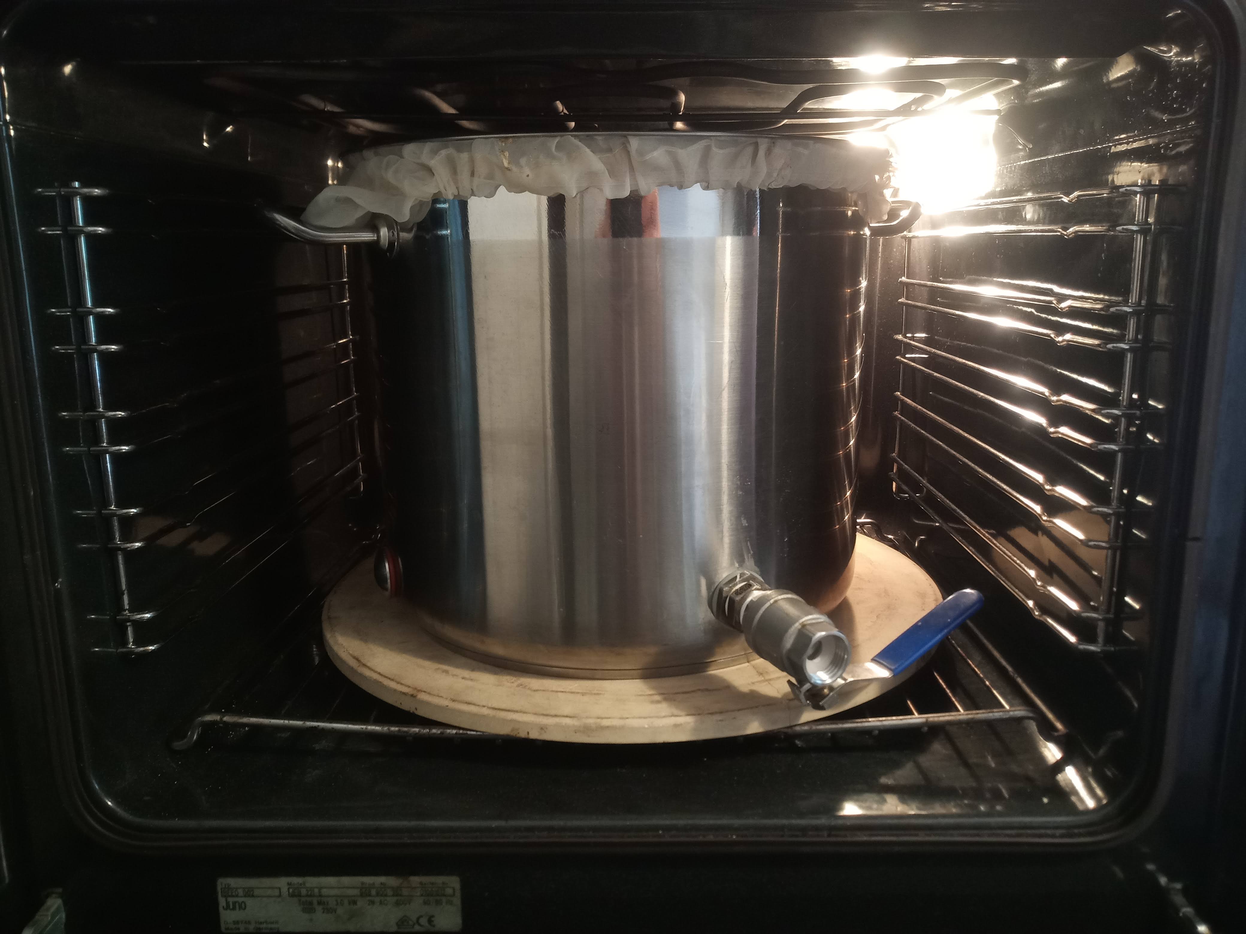 Die Maische kommt im vorgeheiztem Backofen (ca. 70° C).