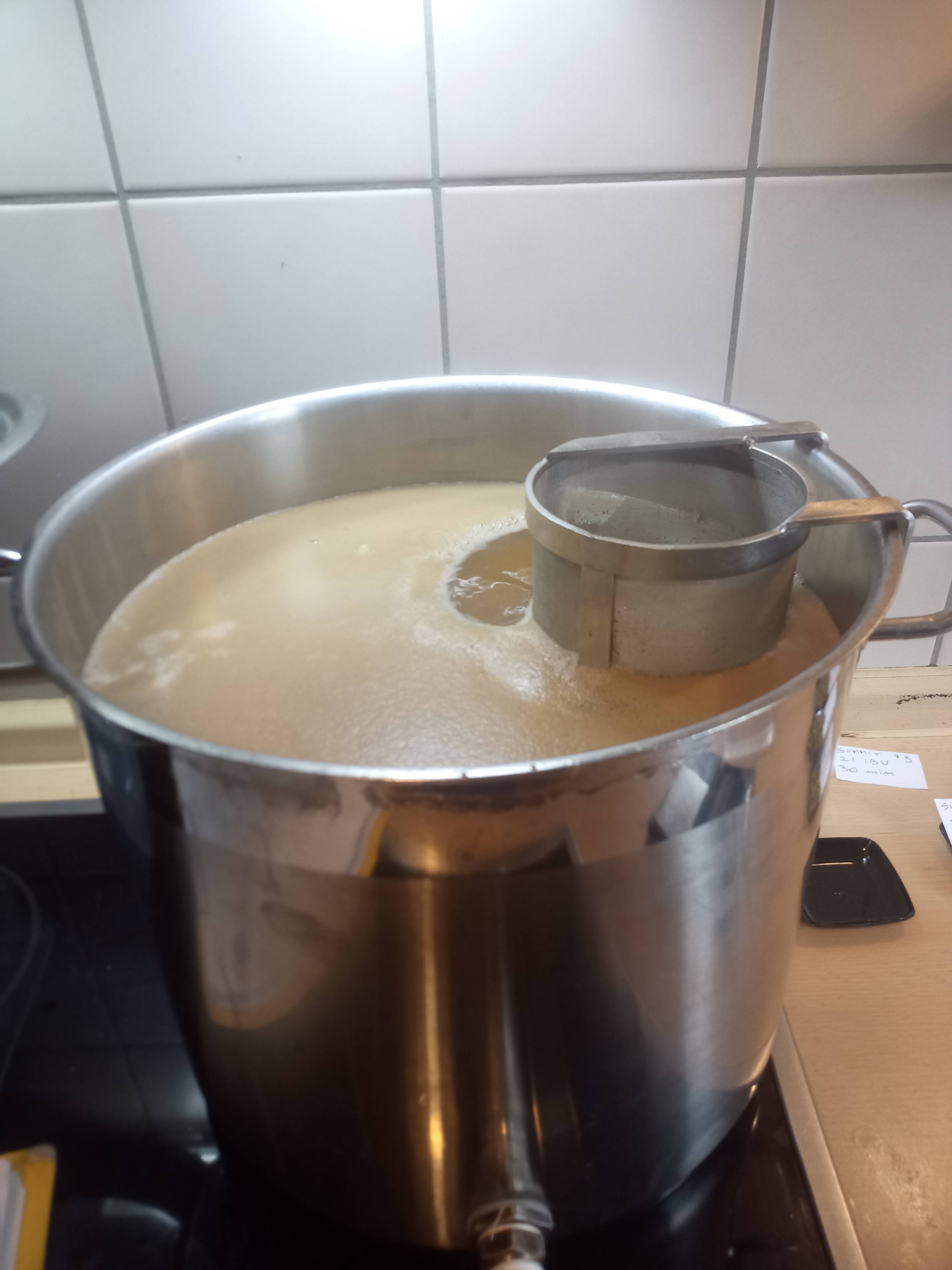 Ich benutze einen Hopfensieb, so kann ich direkt nach Kochende den Hopfen aus der Würze entfernen damit nicht zu viel alpha-Säure (Bitterstoffe) extrahiert wird.