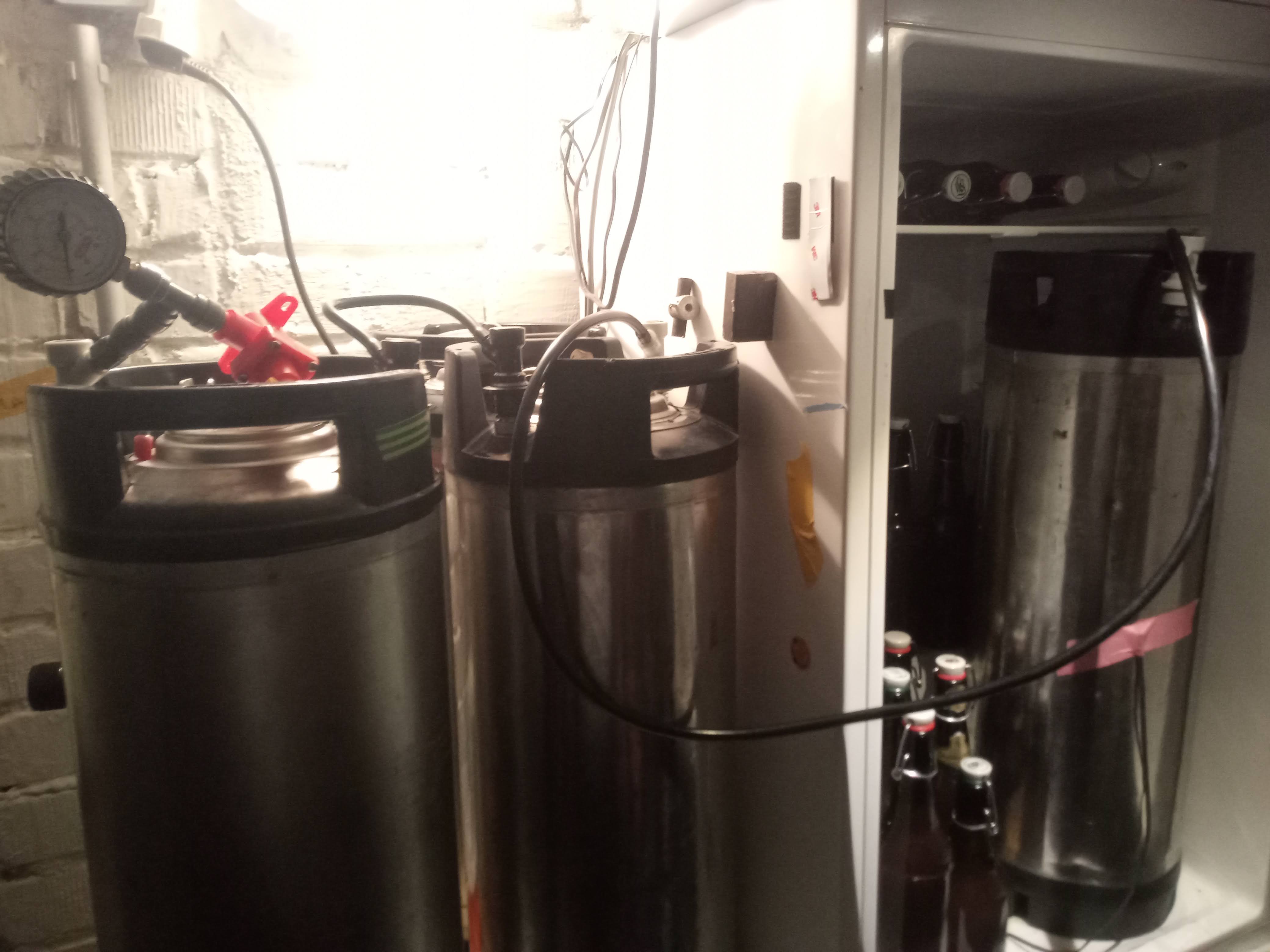 Als Gärkammer benutze ich einen Kühlschrank (10€ bei eBay Kleinanzeigen) der von einem Inkbird ITC-1000 gesteuert wird. Ich habe den Temperaturfühler auf dem Keg mit Kreppband geklebt, die Edelstahlwand leitet die Wärme gut genug dass die Innentemperatur der Würze sich kaum mit der Wandtemperatur unterscheidet.