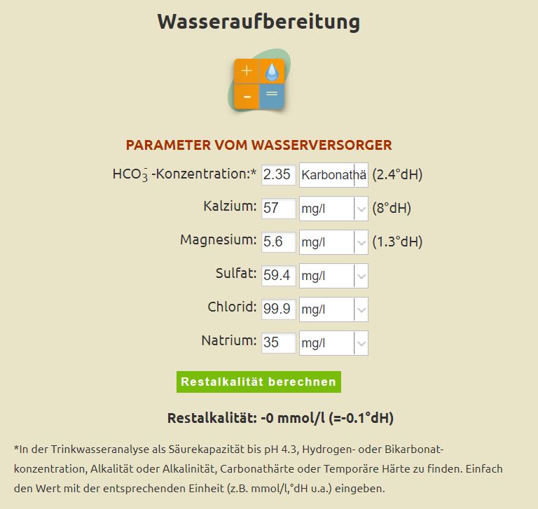 Ich habe alle meine Daten aus der Wasseranalyse eingegeben und komme auf einen RA Wert Restalkalität: -0 mmol/l (=-0.1°dH).