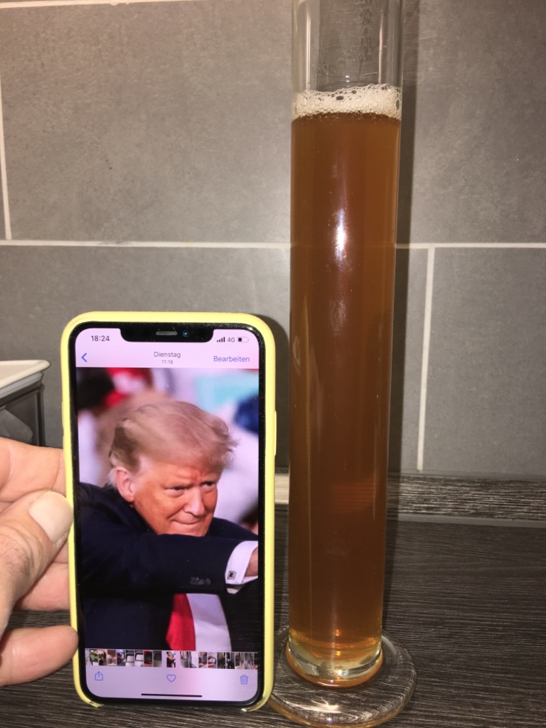 *nicht so ganz Ernst gemeint. Ich habe einem Freund vom Plan berichtet, dass wir das Obama Honey Ale brauen wollen. Der meinte dann, dass man mal ein oranges Bier brauen sollte, dass so unnatürlich wie Donald T. aus W. aussieht. Und bitter sollte es sein. Er hat den Namen beigesteuert und irgendwie ergab sich das dann in einer Lockdown-SMS-Schlacht mit ihm und ein paar Bierchen.