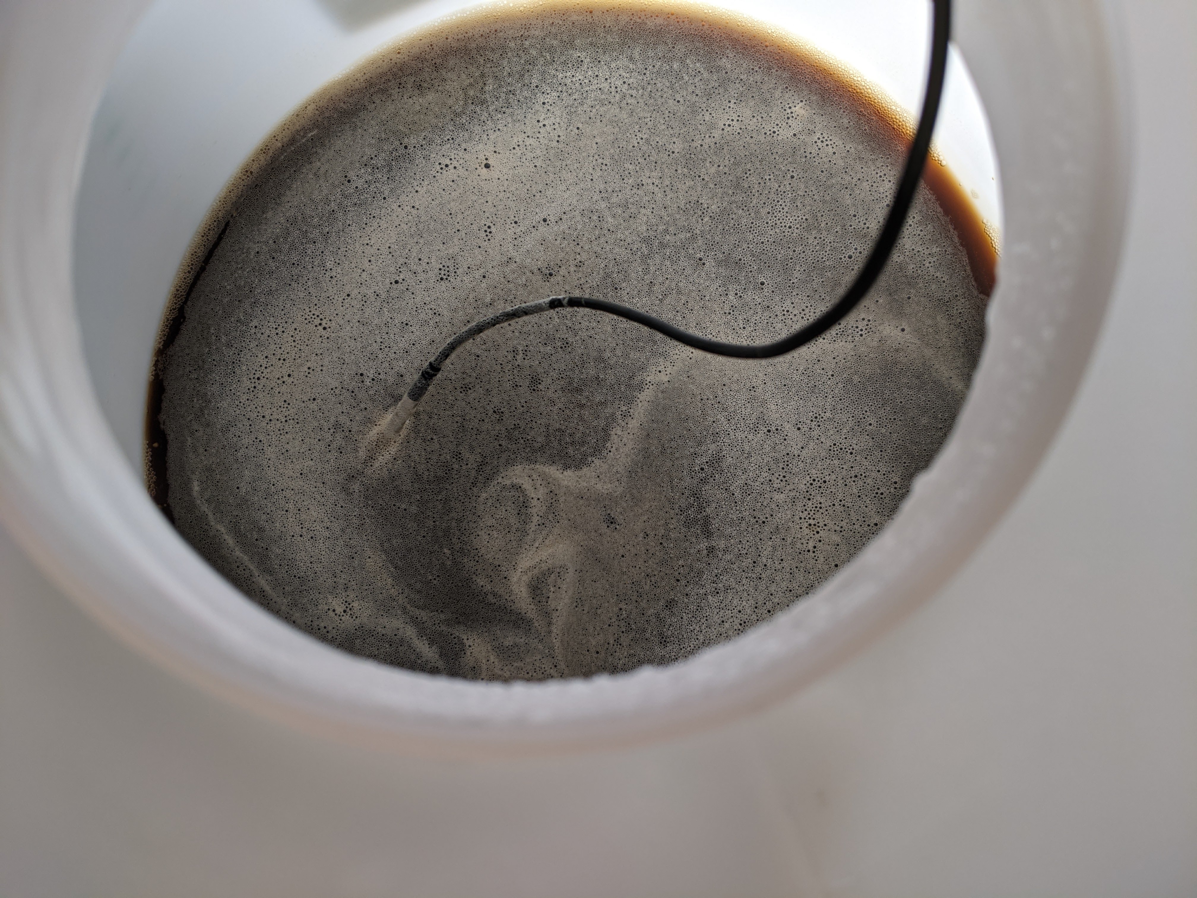 Jetzt wird gewartet bis die Würze die Anstelltemperatur erreicht hat. Durch den Gärspund habe ich noch einen Temperaturfühler in die Würze gehängt, der mir Bescheid gibt wenn's soweit ist. Lang kanns nicht mehr dauern, wenn ich so auf die Uhr gucke.