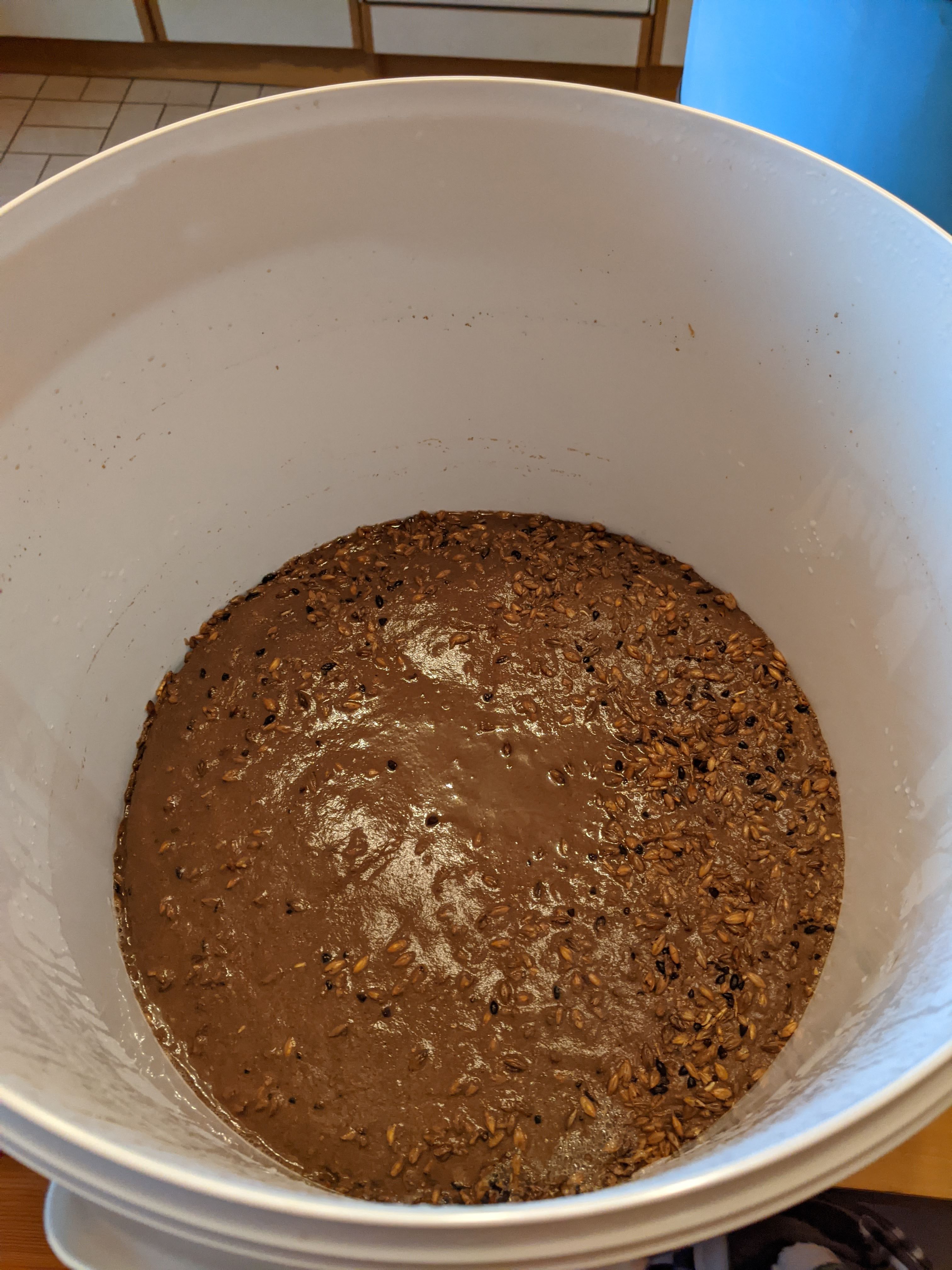 Ich habe vorab von dem Trick gelesen, man solle doch einen Tupperdeckel im Läuterbottich schwimmen lassen und darauf den Nachguss gießen, um den Treber nicht aufzuwirbeln. Scheint zu funktionieren.