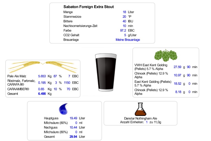 Aufgrund der dann doch ziemlich hohen nötigen Stammwürze und der üblichen Farbgebung im Bereich HeavyMetal bin ich bei einem angepassten Stout gelandet. Folgendes Rezept spuckte mir der Brauhelfer nach etwas Zahlenspielen aus: