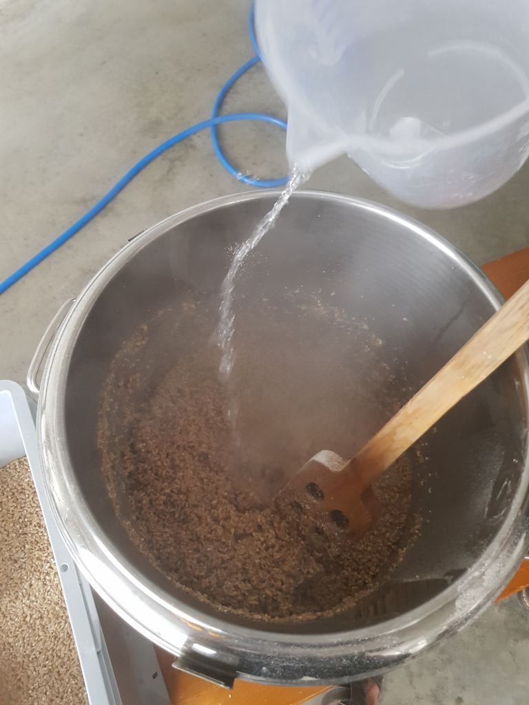 Oberpfalz, Tännesberg: bei 21 Grad Umgebungstemperatur 13,75 kg Pale Ale Malz mit 20 Litern Wasser mit 98 Grad C überbrüht. Dabei erfolgte der Vorgang in mehreren Abschnitten: jeweils 2 - 3 kg Malz zugeben und mit etwa 3 - 4,5 Litern Wasser überbrüht und mit dem Maischepaddel gründlich vermengt. Am Ende hatte die Masse in der isolierten 38-Liter-Maischepfanne 68 Grad C. Um 9.45 Uhr Deckel der Pfanne geschlossen und stehen gelassen.