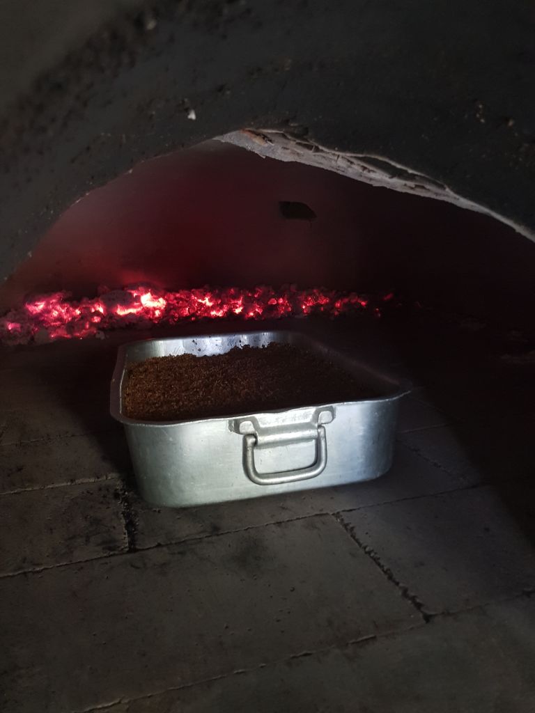 Um 14.30 Uhr mit einer Ähre die Ofentemperatur geprüft. Schwarze Grannen deuten auf zu hohe Temperatur hin. Daraufhin eine halbe Stunde gewartet. Um 15 Uhr haben sich bei einem erneuten Test die Grannen immer noch schwarz gefärbt, jedoch nicht so stark.