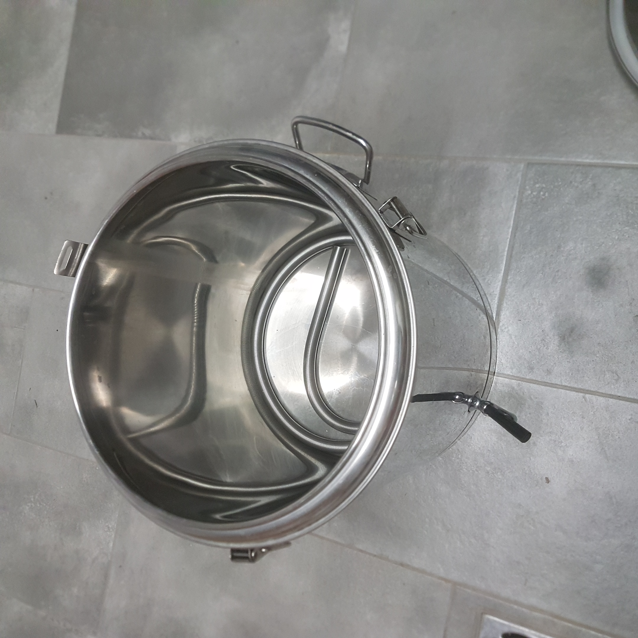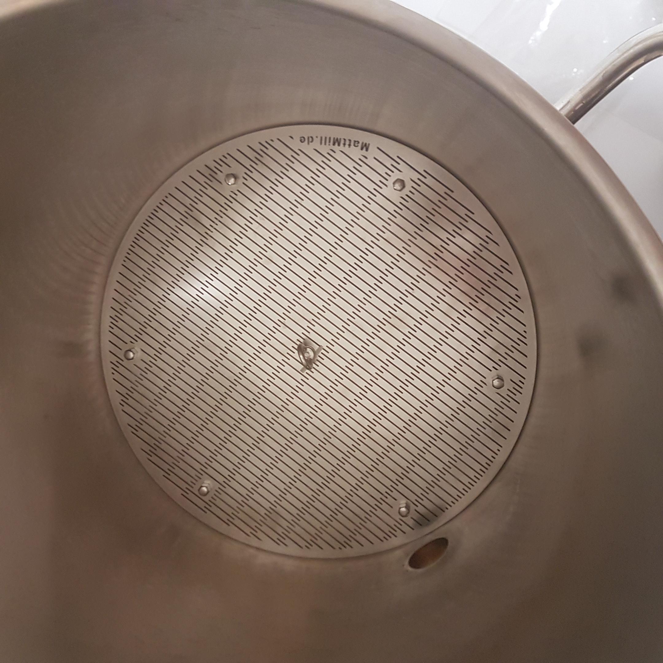 Jetzt mit dem Neueinstieg will ich auf das Läuterblech im 50l Topf umsteigen. Der fix montierte Hahn des Thermepots lässt sich nicht mehr wie gewünscht reinigen. Ausserdem wollte ich den durch das Umfüllen entstanden Sauerstoffeintrag minimieren. Das System funktionierte auch nicht gut - ich musste oft mintenlang schöpfen.