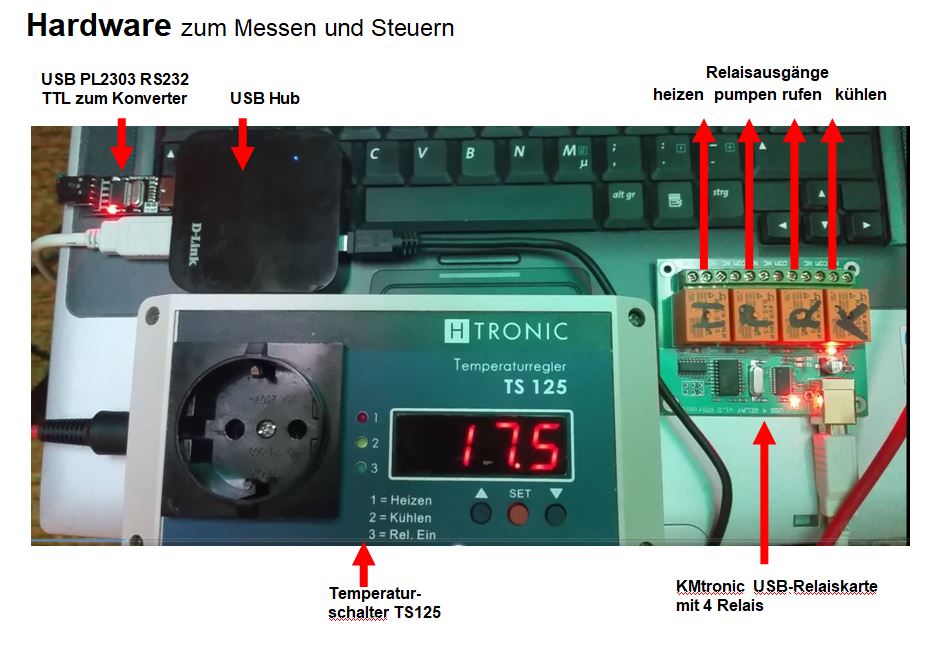 Der Hardwarebedarf beschränkt sich dabei auf einen Temperaturregler TS 125, einen USB-nach RS 232 Adapter, eine Relaiskarte mit 4 Relais sowie einem USB-Hub. Ein USB-Kabel hat man normalerweise. Das alles ist von den Kosten her überschaubar.